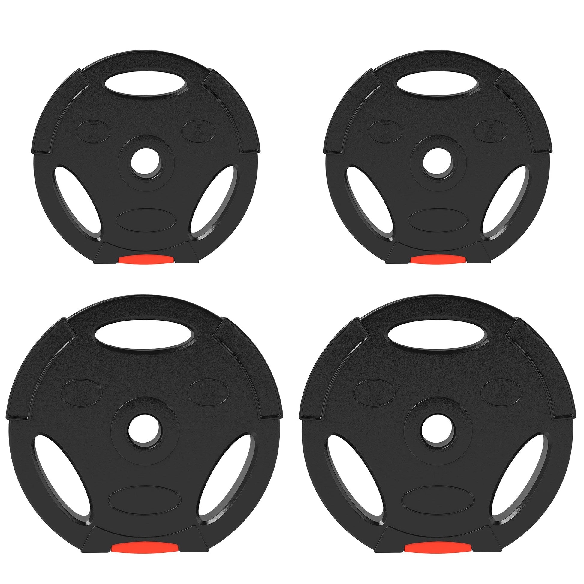Build strength and stay active with the SPORTNOW weight plate set! It includes two 10kg and two 5kg plates, each with a 2.5cm centre hole to fit standard barbells with ease. Designed with three grip holes, they're great for barbell-free exercises too, so you can switch up your routine. The tough polypropylene cover helps protect your floors from drops, so you can train confidently, wherever you lift.