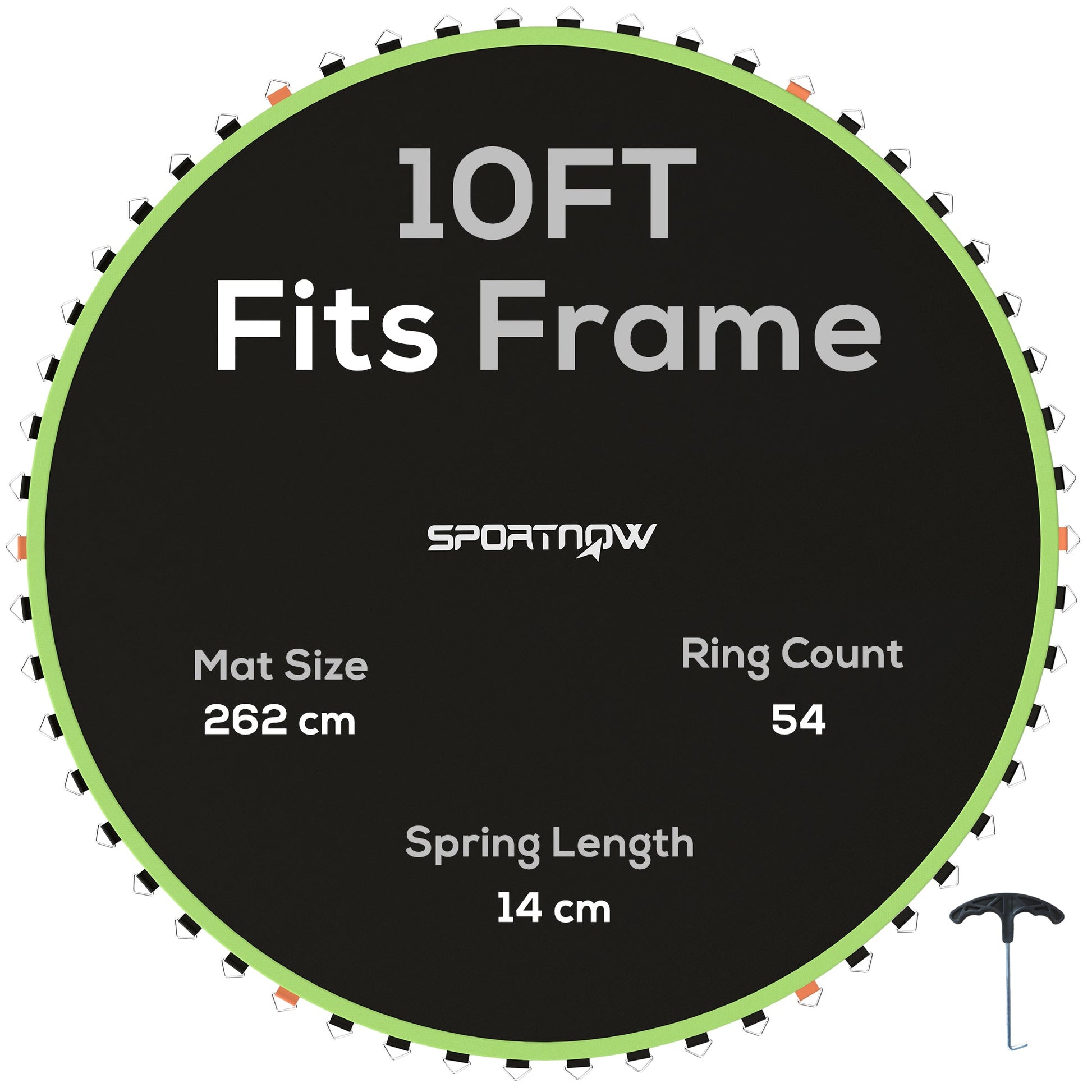- The mat fits a 10ft round trampoline with 54 V-rings, using 14cm springs