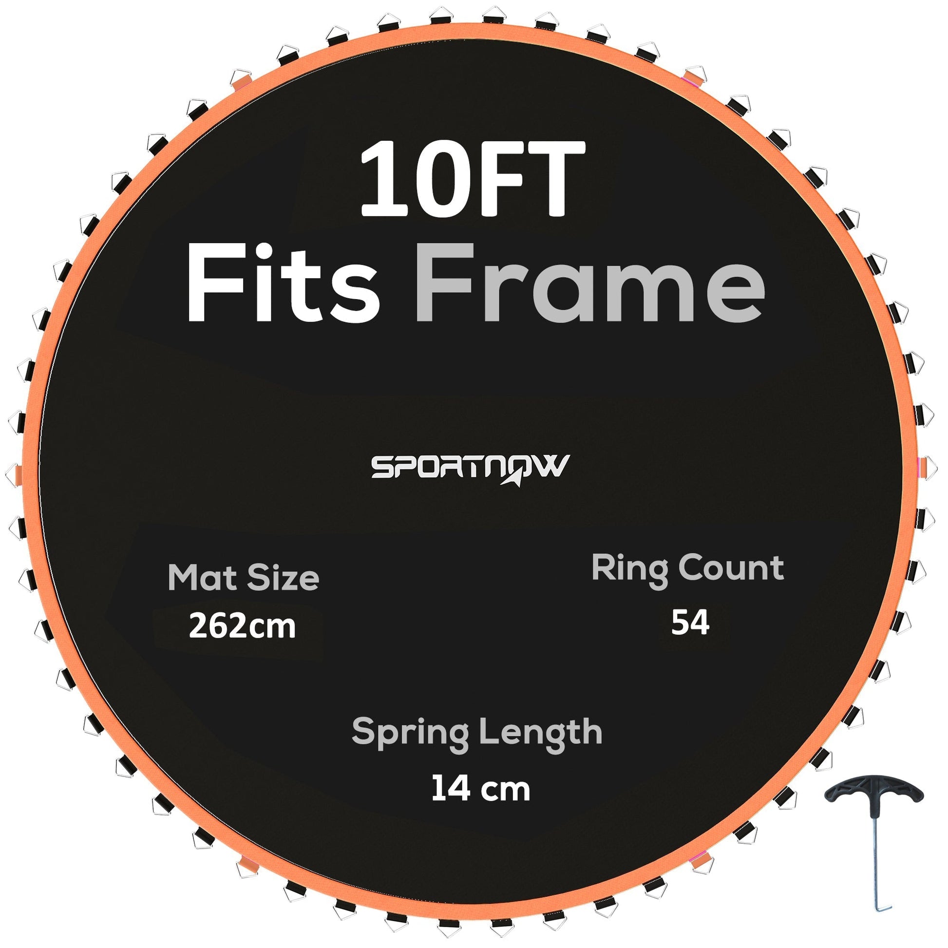 - The mat fits a 10ft round trampoline with 54 V-rings, using 14cm springs