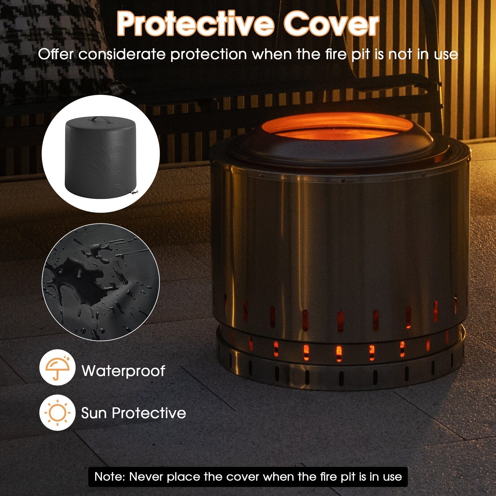 This stainless steel fire pit with unique structure not only brings warmth to you, but also offers you a visual flame feast. Multiple air vents with different shapes and the middle column with fire holes are designed for 3-level combustion which ensures high-efficiency burning and reduces annoying smoke. And the whole fire pit is made of premium stainless steel, which can withstand long-time burning. Moreover, a waterproof and sun protective cover is provided for longer service life of the fire pit. As for the fuels, there are multiple options to meet your different demands. Unique 3-Level Combustion: The unique structure of this fire pit will lead to 3-level combustion. As a result, the outstanding air circulating system and Oxygen-enriched fire technology ensure optimal heat with less smoke and wood. And the smokeless burning technology offers you a clean bonfire atmosphere. Attractive Flame Effect: In the primary combustion, the vent holes on the 2nd layer let direct air in and feeds oxygen for the burning of fuel. Then, the holes on top layer and 8 long vents feed oxygen for the unburned parts and form spiral flame, which is secondary combustion. Plus, with the bottom air vents, the airflow flows from the bottom up to the middle column, creating corn-like flame and burning off smoke particles before it gets out of the fire pit. which is tertiary combustion. Premium Stainless Steel: The fire pit consists of 3 parts: fire ring, firebowl and body. All parts are made of premium stainless steel for long-lasting service life. Note: As the plant ash is alkaline, the fire pit will slightly rust after several time to use. And the ash tray may be slightly deformed after high-temperature burning. But these won't affect normal use. Functional Protective Cover: The protective cover which resists to water and sunlight is included to offer considerate protection when the fire pit is not in use. Note: Never place the cover when the fire pit is in use. Multiple Optional Fuels: The large inner space of the fire pit allows you to put more fuels for continuous burning. And there are multiple optional fuels, such as charcoal, firewood and wood pellet. Once burned, the fire pit will offer all-direction warmth, spreading heat to everyone sitting around. Suitable distance for warming: 61-305cm.