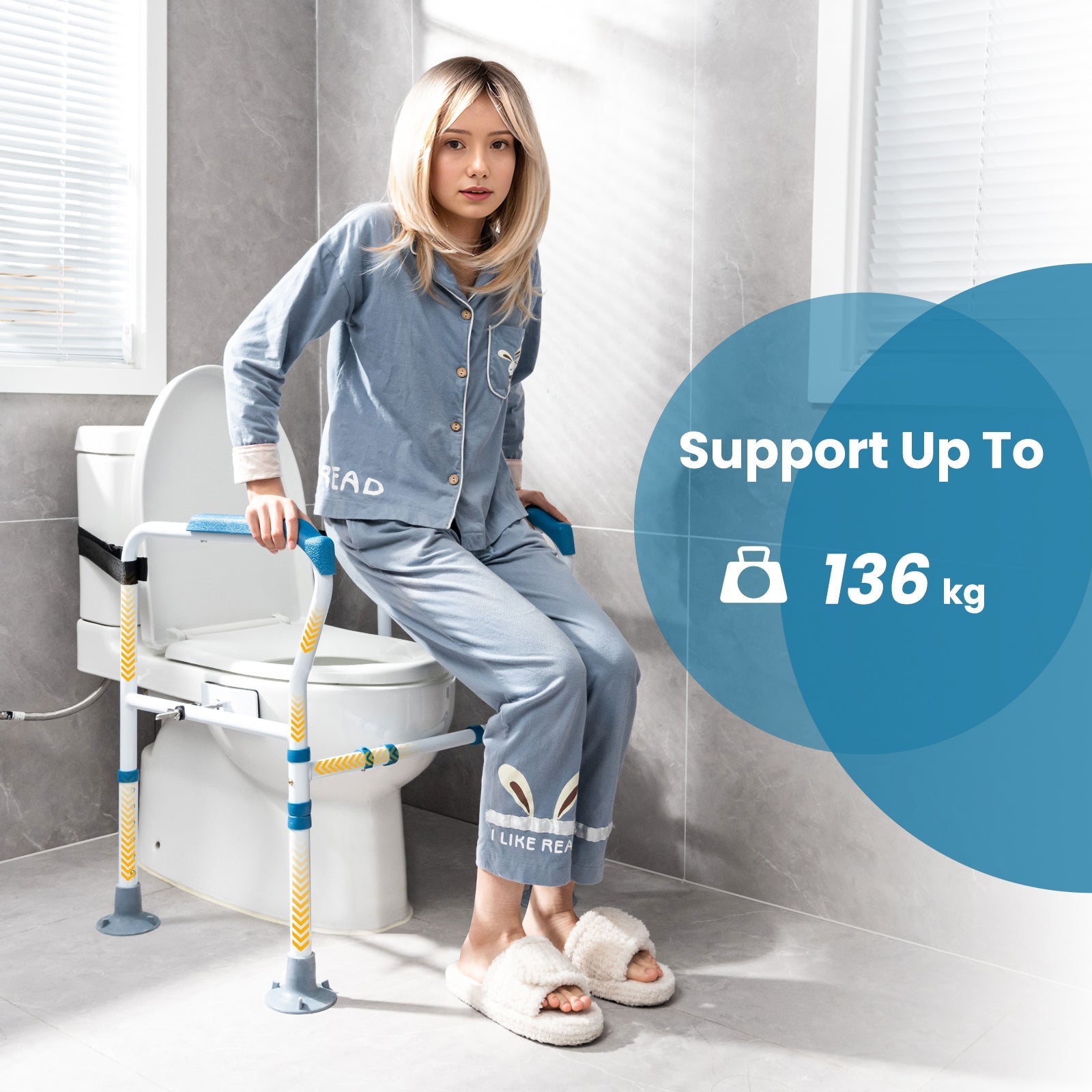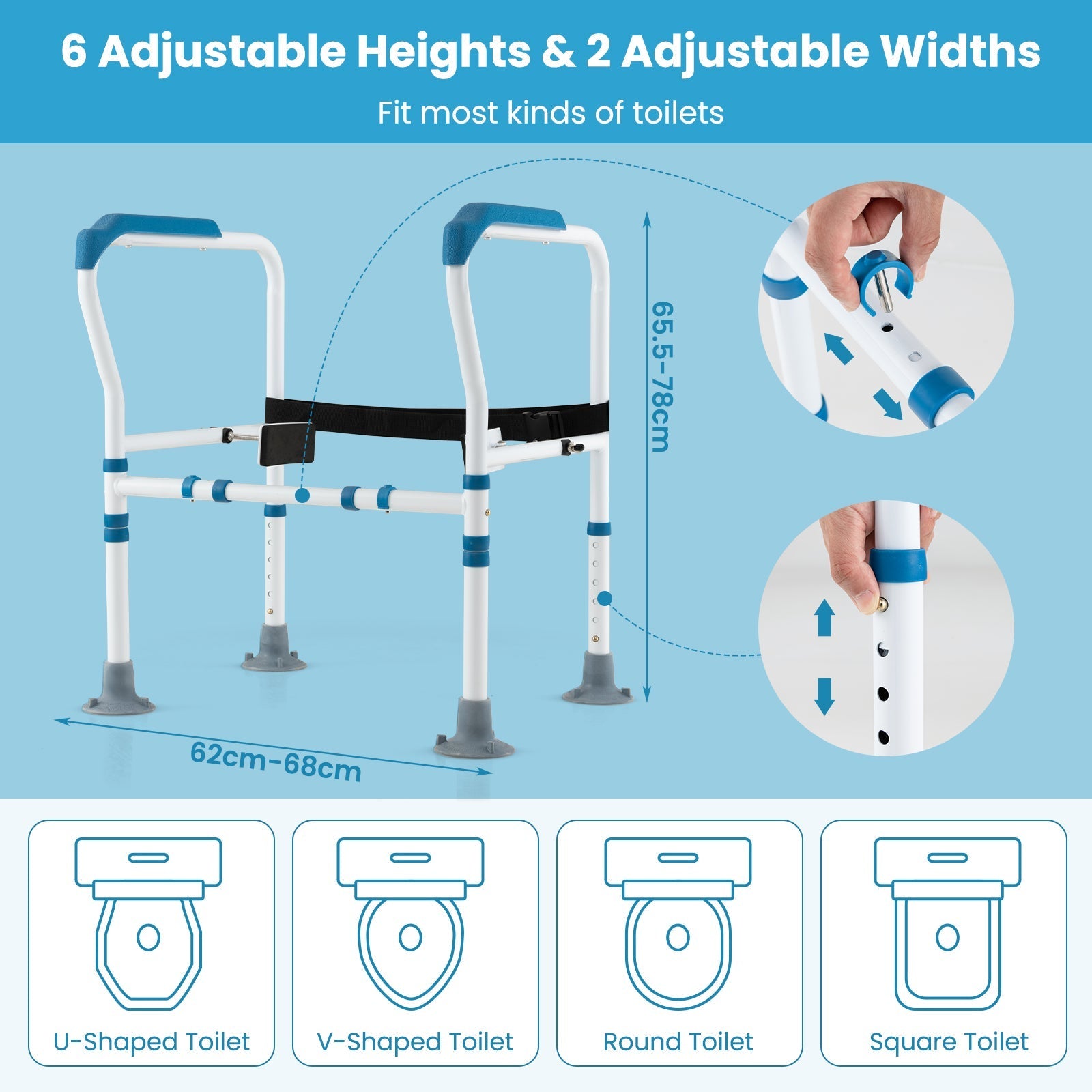 Colour: Blue + White Material: Carbon Steel + HDPE Overall Dimension: 62-68 cm x 49.5 cm x 65.5-78 cm (L x W x H) Adjustable Height Range: 65.5-78 cm Adjustable Width Range: 62-68 cm Net Weight: 4.5 kg Box Qty:1(May vary by batch)Package includes: 1 x Toilet Safety Rail 1 x Instruction Manual