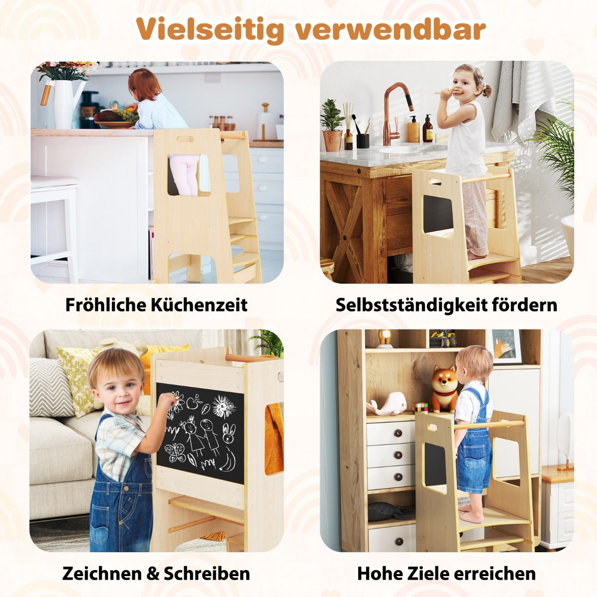 -Can grow with your child with a platform with 2-level adjustable height-Built with 2 chalkboards for drawing and writing-Crafted with solid wood material and well-made details-Avoids scratches with smooth rounded edges-Enhanced security with an anti-falling safety rail-Easy to move between rooms with portable handles-Prevents floor damage with protective foot pads-Suitable for reaching high places, cooking with families, etc.-Easy assembly with step-by-step instructions