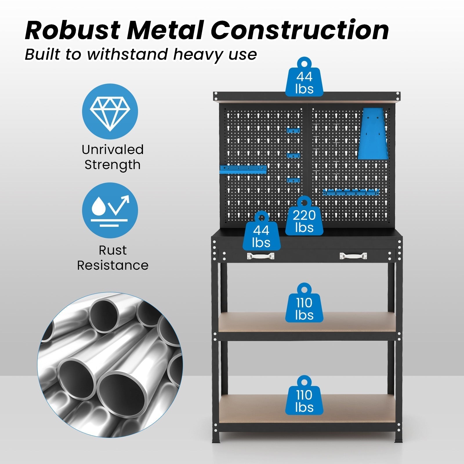 Looking for an impeccable workbench to keep your tools organized? This tool storage workbench is an ultimate solution for all your work needs. Crafted with a heavy-duty metal frame, it offersunrivaled strengthand durability. Say goodbye to rust worries, as this workbench is built to resist rust, ensuring a long-lasting service life. Not only does this workbench deliver on sturdiness, but it also boasts high functionality. Whether you need it for your garage, workshop, office, or yard, this versatile workbench will fit right in. Its tabletop height is ergonomically designed to provide maximum comfort while you work.No more wasting time searching for misplaced tools, as the workbench offers ample storage space, ensuring a tidy working area and reducing the hassle of locating your tools. To further cater to your diverse needs, the workbench comes equipped with a wide range of hanging accessories.Choose this tool storage workbench for a comprehensive solution that combines durability, functionality, and style! Versatile Storage Solution: This workbench offers a variety of storage options, including a top shelf, two pegboards, a spacious tabletop, one drawers and two open shelves. These compartments provide organized storage space for a range of items, such as cordless drills, spanners, screwdrivers, and toolboxes. Efficient Pegboard Display: The two pegboards can be easily connected, creating a wide space for hanging tools. The orderly arrangement of hanging holes enables effortless organization and keeps all your tools in order. Additionally, the pegboard comes with 13 hanging accessories to meet your diverse needs. Robust Metal Construction: Crafted from high-strength metal frame, this workbench is built to withstand heavy use. The plastic sprayed surface adds rust resistance, ensuring a long-lasting service life. Furthermore, the anti-slip footpads protect your floor from scratches. Versatile Applications: This tool storage workbench is suitable for a wide range of places. The high functionality makes it an ideal choice for garages, workshops, schools, tool sheds, warehouses, basements, and more. It serves as a reliable assistant to enhance your working efficiency. Easy Assembly: The package includes all necessary hardware and accessories, and each part is numbered for convenient assembly. Simply follow the clear step-by-step instructions provided, and you’ll have your workbench ready for use in no time.