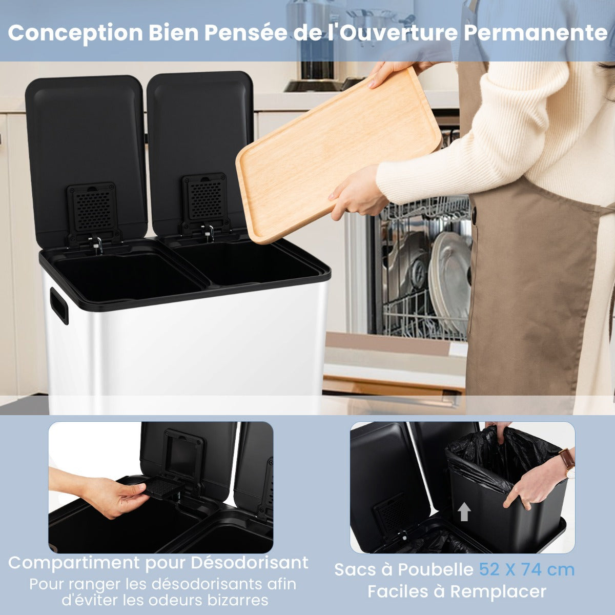 Utilize the trash can to eliminate chaos in your rooms! With its dual compartments and a whopping 60 L capacity, the trash can is a sorting superstar of recyclable and food waste. No more jarring lid slams - its silent lid will offer soft closing to make you forget about noisy trash cans for good. Crafted from sturdy stainless steel, it fights off fingerprints and maintains its dazzling shine. The sealed lids trap unpleasant smells in, while 2 deodorizer compartments hold deodorizers (not included) to avoid weird smells. And here's the best part: replacing trash bags is a breeze, thanks to 2 removable liners. This trash can is portable, complete with side handles. Its wide base with anti-slip foot pads ensures both convenience and floor protection. Also, it is easy to replace 8 gal trash bags. Say goodbye to ordinary bins and embrace this exceptional garbage bin. If you are looking for a trash can like this, do not hesitate to place an order! Dual Barrels for Sorting: To hold all your trash, the garbage bin has 2 compartments to offer great capacity up to 60 L. Meantime, its dual-barrel design creates separate spaces that allow you to classify your trash into recyclable and food waste. Soft Closing and Stay Open: Controlled by the pedal, the silent close lid will open smoothly. When removing the foot, it will close slowly, without any banging. More, the trash can features a stay-open design, which will give you ample time to clean up trash. 3-Tiered Stainless Steel: The trash can has a brushed stainless steel frame, which is strong to avoid deformations. Also, it is fingerprint-proof and able to maintain a shiny look. By the way, its ideal smudge resistance will make the maintenance a breeze. No Odors and Easy to Use: Except for hiding chaos, the garbage bin also blocks odours. With sealed lids, weird smells get trapped inside, while 2 deodorizer compartments hold deodorizers to avoid weird smells. As 2 liners are removable, it is easy to replace trash bags of 30 L. Easy to Move and Wide Use: Thanks to side handles, you can easily move the trash can to any corner of kitchen, office, dining room, etc. In addition, it features a wide base with anti-slip foot pads that is friendly to the floor and helpful to avoid scratches.