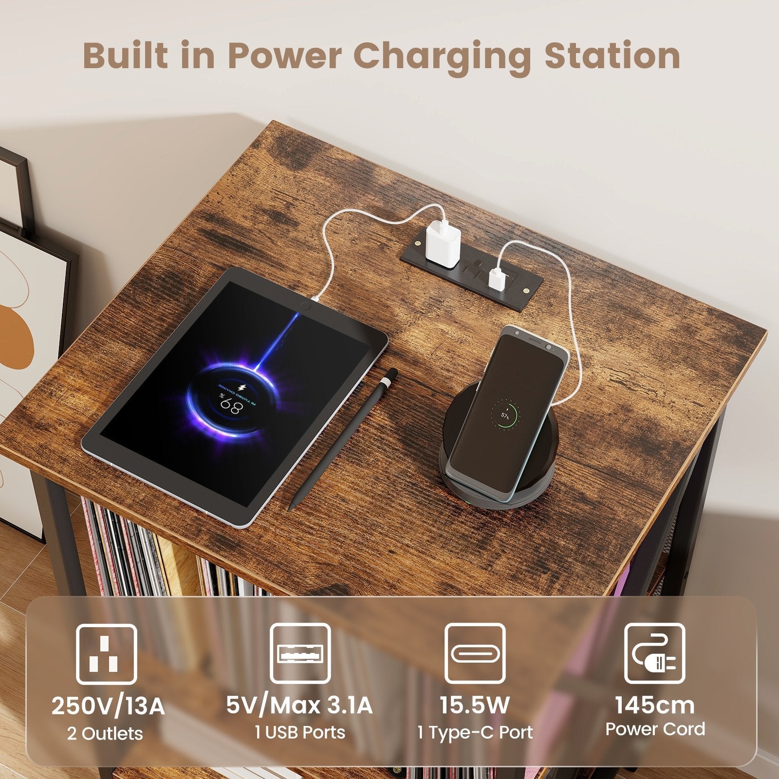 Featuring extra open storage shelf and storage compartment with dividers, this stand is perfect for organizing your vinyl record collections, books, CDs, or audio. The built-in charging station with 2 AC power outlets (250V/13A), 1 USB ports (5V/Max 3.1A) and 1 Type-C Port (15.5W) ensures you can charge your electronic devices hassle-free. Glide smoothly on any surface with the 4 wheels, and 2 lockable wheels added stability. Crafted with superior craftsmanship, the metal support legs and sturdy connections guarantee durability, while the wear-resistant wooden boards are effortless to clean. You can customize your space as the dividers can be removed. This stand can be used as a record storage rack, bedside table, or mini coffee table. Complete with a detailed instruction manual and all accessories for easy installation. Large Storage Space: Keep your leisure space organized and stylish with this record player stand featuring dividers. Showcase your audio, CD or book on the open storage shelf, while the spacious top is perfect for a phonograph or bedside lamp. Built in Charging Station: Say goodbye to tangled wires with 2 outlets, 1 USB ports and 1 type-c port on this versatile turntable stand. More, the 145cm long power cord easily connects the side table to a power supply. 4 Smooth Universal Wheels: Maneuver your vinyl storage cabinet with ease using the 4 silent wheels that glide smoothly across surfaces. You can also lock 2 wheels for enhanced stability and peace of mind while using the stand! Better Workmanship: Enjoy a reliable vinyl storage cabinet with solid metal frame with firm connections. The thick wooden boards are highly wear-resistant and feature a easy-to-clean surface that ensures worry-free maintenance. Versatile Usage: Customize your space by removing the dividers to transform this record player stand into a versatile piece of furniture. Use it as a vinyl record storage rack, bedside table, or mini coffee table. Complete with a detailed instruction manual and all accessories for a seamless installation process.