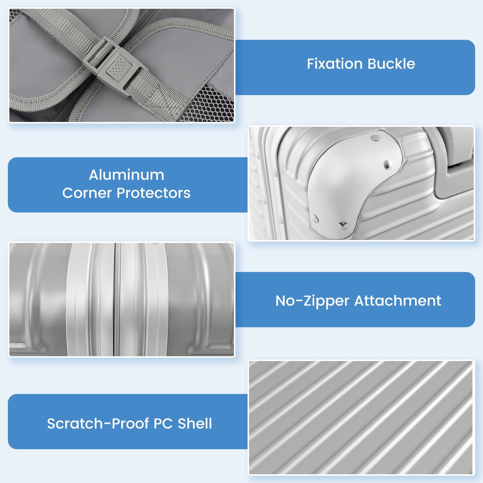 Selected PC material takes the advantage of being wear resistant and scratch resistant, ensuring longer service life. The spacious inner space is ideal to store travel essentials and keeps them in order. More, there is a detachable 15" laptop pocket for storage convenience and considerate protection. Upgraded TSA lock is easy pass most international countries customs security check. Considering convenient use, the telescoping handle makes it easy for people of different heights to pull along. In addition, durable spinner wheels allow for a flexible movement on different kinds of rounds. All in all, the under seat carry on luggage is airline approved and can fit in the overhead bin. Lightweight Yet Robust: This carry on luggage is made of 100% high quality PC material that is lightweight and durable, resist to scratch and wear, keeping a shiny appearance trip after trip. Besides, 4 aluminum corners provide further protection. Considerate Protection for Laptop: Say goodbye to messy packaging! The lightweight suitcase features a detachable pocket that keeps laptop and tablet well protected. Spacious inner space with 34 L storage capacity facilitates the placement of clothes and sundries. Durable Spinner Wheels: The travel case is equipped with 360°durable spinner wheels for easy movement, which combines wear-resistant, silent and lower friction. It is applicable to different terrains, such as asphalt road, cobbled road, brick road and speed bump. Well Crafted Accessories: With secure TSA lock, the carry on suitcase can easy pass most international countries customs security check, saving much time. Ergonomic telescopic handle with multi-steps adjustment offers much convenience. The no-zipper luggage is fitted with a waterproof rubber strip to protect your belongings . Airline Approved and Proper in Size: With the overall dimension of 43 x 44 x 24 cm(L x W x H), the carry on luggage is easy to fit in the overhead or under seat. And the lightweight travel case only weighs 8 lbs and is airline approved.