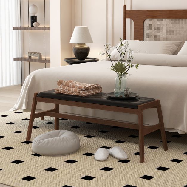 Are you looking for a perfect combination of style and functionality in your home furnishings? Look no further than this exquisite, sturdy upholstered bench. Its robust A-shaped frame and high-quality wooden materials guarantee support for up to 150 kg, catering to diverse usage scenarios with ease. Besides, it can be used as a charming dining bench, a convenient shoe bench, or a sophisticated end-of-bed bench. The luxuriously soft sponge cushion seat provides ultimate comfort, inviting you to unwind and relax, while the elegant wear-resistant PU leather and robust rubber wood legs promise years of durable service. Moreover, enhanced with a reinforced crossbar for added stability, this bench's wide application and chic design, featuring a brown frame and black cushion, effortlessly complement any interior, whether it be your living room, bedroom, dining room, or entryway. This bench is not just a piece of furniture, it's an upgrade to your living space. If you are looking for an upholstered bench like this, do not hesitate to place an order! Sturdy Upholstered Bench: Boasting a durable A-shaped frame and selected wooden materials, this bench confidently supports up to 150 kg. Besides, the reinforced crossbar design strengthens the entire structure. 3-in-1 Multifunctional Design:This versatile bench can be used as a cozy dining bench, a practical shoe bench, or a stylish end-of-bed bench. It adapts fluidly to your needs, bringing convenience and class to your living environment. Soft Sponge Seat Cushion: This dining bench comes with a soft sponge cushion seat, which offers great support to your buttock and helps you relieve fatigue. With it, you can enjoy a leisurely afternoon. Durable Material and Easy Cleaning: Featuring premium PU covering, this upholstered bench offers a wear-resistant seat, which is suitable for long-time service. The maintenance is a breeze, you can wipe the seat surface with a wet cloth. Wide Application:With its chic brown frame and black cushion, this bench seamlessly blends with diverse interior themes. Its ample seating space is not just for comfort but also makes it a perfect addition to your living room, bedroom, dining room, or entryway.