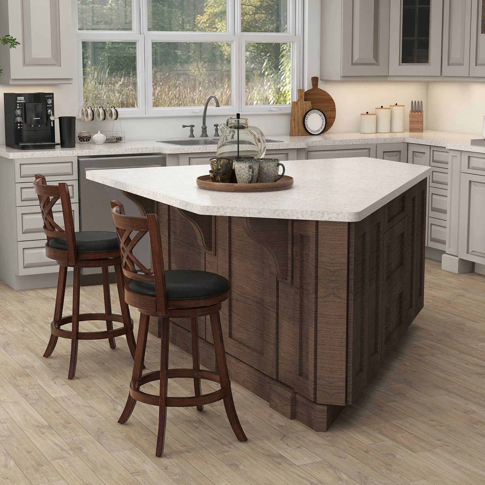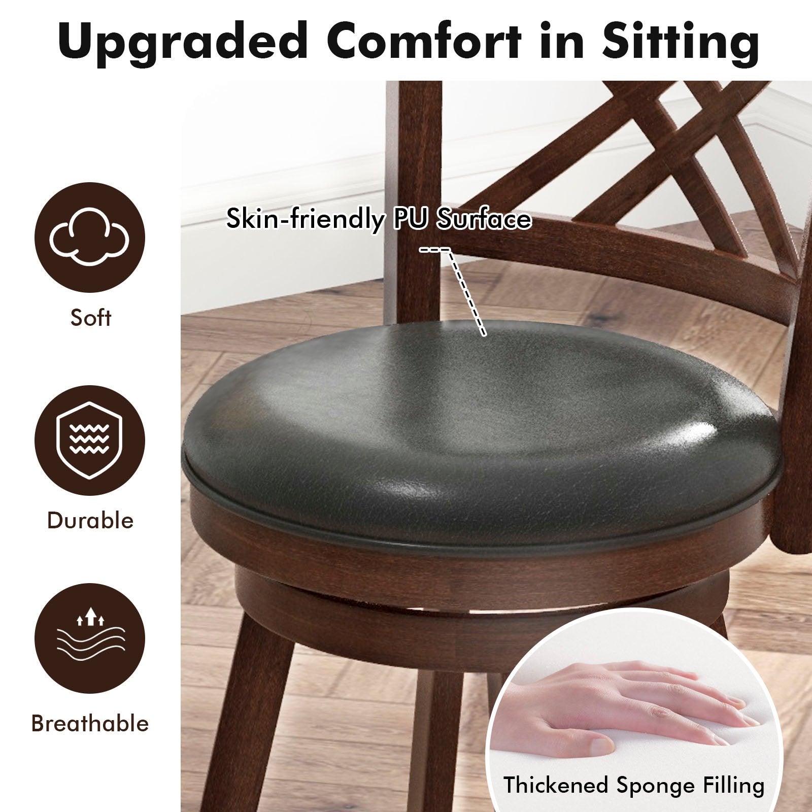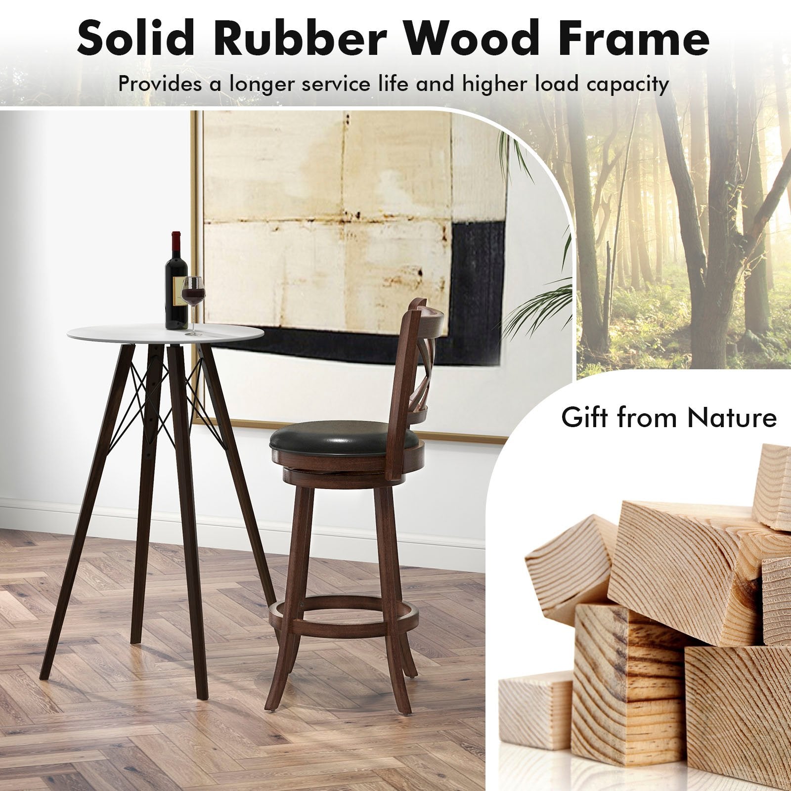 Indulge in comfort and aesthetics with the bar stool set of 2! With a 360° swivel seat, you can sit on the bar stool and turn around to have conversations with friends in any direction. The softly padded seat provides you with unparalleled comfort even during extended periods of sitting. Even better, the bar stool is fitted with convenient footrest to give your feet a place to perch. Supported by natural solid rubber wood frame, the wooden bar stool withstands the test of time and boasts excellent load-bearing capacity. Plus, its fine craftsmanship and elegant style make it a charming addition to your bar or kitchen counter. Swivel Seat with Backrest: Designed with 360° rotatable seat, the swivel bar stool allows you to reach items or engage in conversations in any direction. Besides that, the ergonomic curved back well fits the natural curve of your spine to reduce discomfort in the back. Solid Rubber Wood Frame: Crafted of natural rubber wood frame, the wooden bar stool is a gift from nature, which provides a longer service life and higher load capacity. Compared with engineered wood frame, our solid wood frame is less likely to warp or deform over time. Upgraded Comfort in Sitting: The upholstered bar stools feature skin-friendly PU surface and high-density sponge filling, giving you the ultimate comfort while seated. In addition, the wooden bar stools are fitted with convenient footrests to give stable support to rest your feet. Vintage Style for Wide Use: The accent bar stools are embellished with ornate details of smooth round seat and exquisite crossed design on the backrest. The vintage style makes the bar stool set of 2 a stunning piece for your kitchen island, bar counter and more. About Heights and Assembly: The bar stools are available in 2 sizes for you to choose: 61cm counter height stools or 74cm bar height stools. Please remember to measure your counter or bar height before purchasing. We also provide detailed instructions for hassle-free assembly.