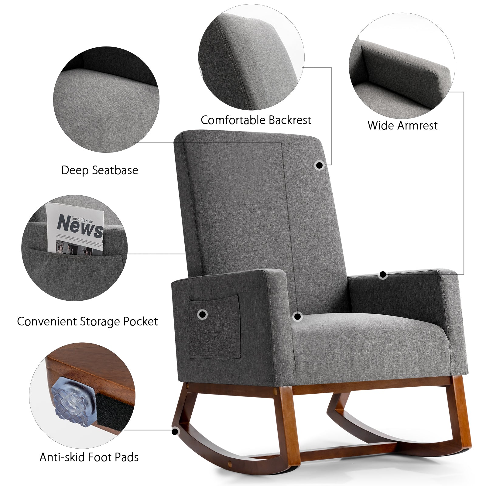 Set up a perfect spot for you to lounge away the time with this leisure rocking chair! Soothing motions and overstuffed seat cushion have you nurse and bond with your baby in ultimate leisure, while the solid rubber wood base confidently supports your weight up to 330 lbs. It also comes with wide armrests and high backrest to elevate the comfortable level. The rocking chair has a clean, contemporary design that brings the perfect blend of classic style and modern tendency, ideally matching your living room, bedroom and office. You will be pleased to find out there is a convenient side pocket for extra storage. Gentle Rocking Motions: This accent rocking chair is designed to deliver gentle rocking motions, and gives you ultimate soothing lounging after a long day. It creates a leisure spot in your nursery, living room and other shared places. Solid Wood Base: Natural logs as its base frame, this rocking armchair features solidity and a maximum weight capacity of 150kg. An extra wood plate stuck between two legs double-secures this rocking chair with excellent stability and durability. Overstuffed Seat Cushion: The whole seat base has been wrapped up with high-density sponge and breathable linen fabric. And the breathable cushion relieves pain and sourness from sitting for a long while and also provides your body with soft support. Moreover, a side pocket is ready for you to toss your books and remote over. Ergonomic Details: The overall dimension of this rocking chair is 66 x 90 x 99cm (L x W x H), with an ample seat base 48 cm deep and 48 cm wide. Tall back and contoured armrests make sitting on this chair a pleasant and comfortable experience. Mid-century Appealing: A retro-inspired rocking armchair, but also in line with modern aesthetic. Combining fabric texture with natural rubber wood legs, this rocking chair will be a versatile option for any home and office decor.