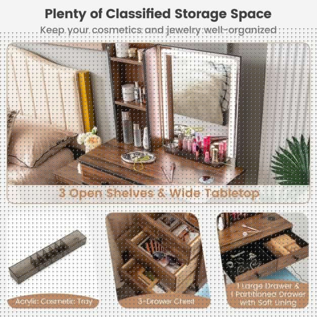 Vanity Table Set with 3-Color LED Lights Mirror and Charging Station-Brown