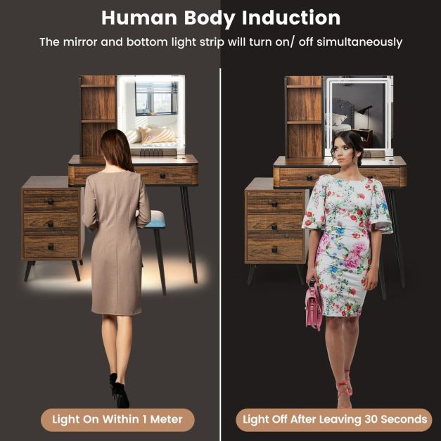 The dressing table stool set is a perfect gift choice for your girlfriend, wife, daughter! The LED lights on the mirror and LED strips under the dressing table feature 3 colour temperatures and 5%-100% brightness to satisfy your various light requirements. And the memory function and human body induction function bring more convenience to your daily life. The charging station on the tabletop is available for wireless charging. Built with drawers, storage shelf and cosmetic tray, you can well organize jewellery, cosmetics, skincare products, etc. Customize Your Desired LED Lighting: The mirror light and light strip under the dressing table are controlled through the touch buttons on the mirror. The LED lights are adjustable with 3 colour temperatures and 5%-100% brightness, meeting your light requirement for various makeups. Warm reminder: colours of mirror light and light strip don’t always match. Charging Station andSensing Function: The tabletop is designed with a 3-in-1 charging station including wireless charging, USB and type-C interfaces, which is convenient to charge your phone or other appliances during making up. The human body induction function will auto-turn lights on when you walk close to the makeup table while the memory function can save your favorite lighting state. Keep Everything Well Organized: The vanity table and stool set is built with 2 drawers, a 3-drawer chest, storage shelves and cosmetic tray. So you can store not only jewellery but also skin care products, cosmetics and other essentials. One of the drawers is specially equipped with soft lining and slots for jewellery storage. Stylish Vanity Set with Stool: The vanity table set comes with a matched stool which has thick padded seat cushion for comfortable sitting experience. The simple appearance makes this dressing table and stool set suitable for various furnishing styles while exquisite grain on the surface adds more charm to your room. Easy Assembly and Stable Structure: The assembly is no longer troublesome. The 3-drawer cabinet under the tabletop can be installed left and right according to your needs. The strong steel frame combines with high-quality MDF, ensuring prolonged service life. The height-adjustable foot pads can protect your floor from scratches and keep the makeup desk set balanced on rough surface. Also, the top mirror can be removed to serve as a writing desk.