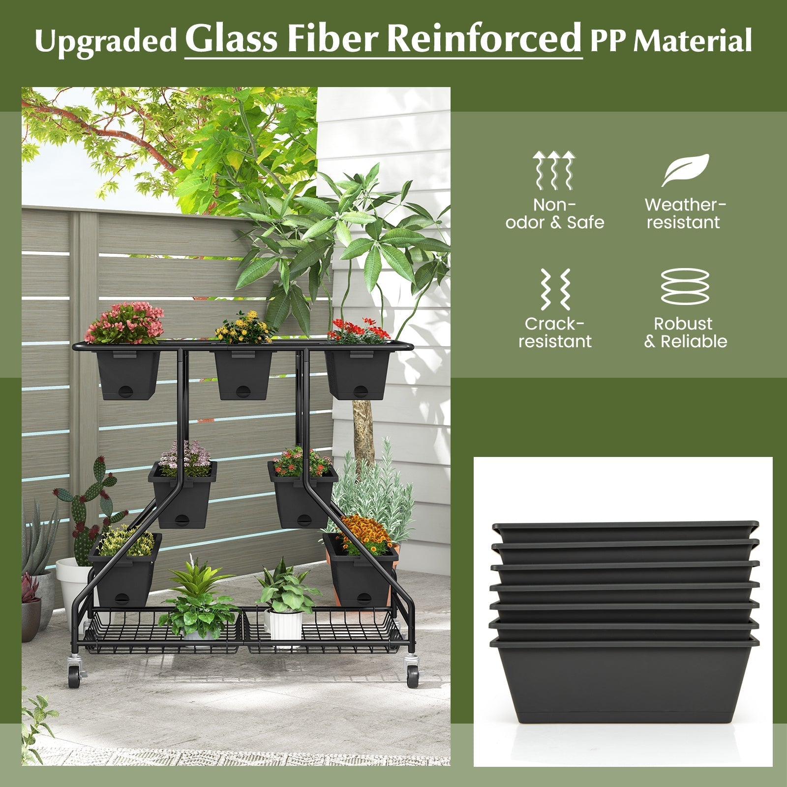 '-Crafted of glass fiber reinforced PP, weather-resistant and crack-resistant-Equipped with 7 individual planter boxes, provide ample space for various plants-The supporting frame features convenient brackets, easy to detach planter boxes-Equipped with 2 detachable storage baskets on the bottom for added convenience-With removable trays, and there are outlet holes, excess water is effectively drained-The staggered placement of planters makes plants enjoy full sunlight and better growth-4 casters can be locked, ensure that it stays securely in place when desired-4 smoothly rolling casters make moving the garden bed a breeze