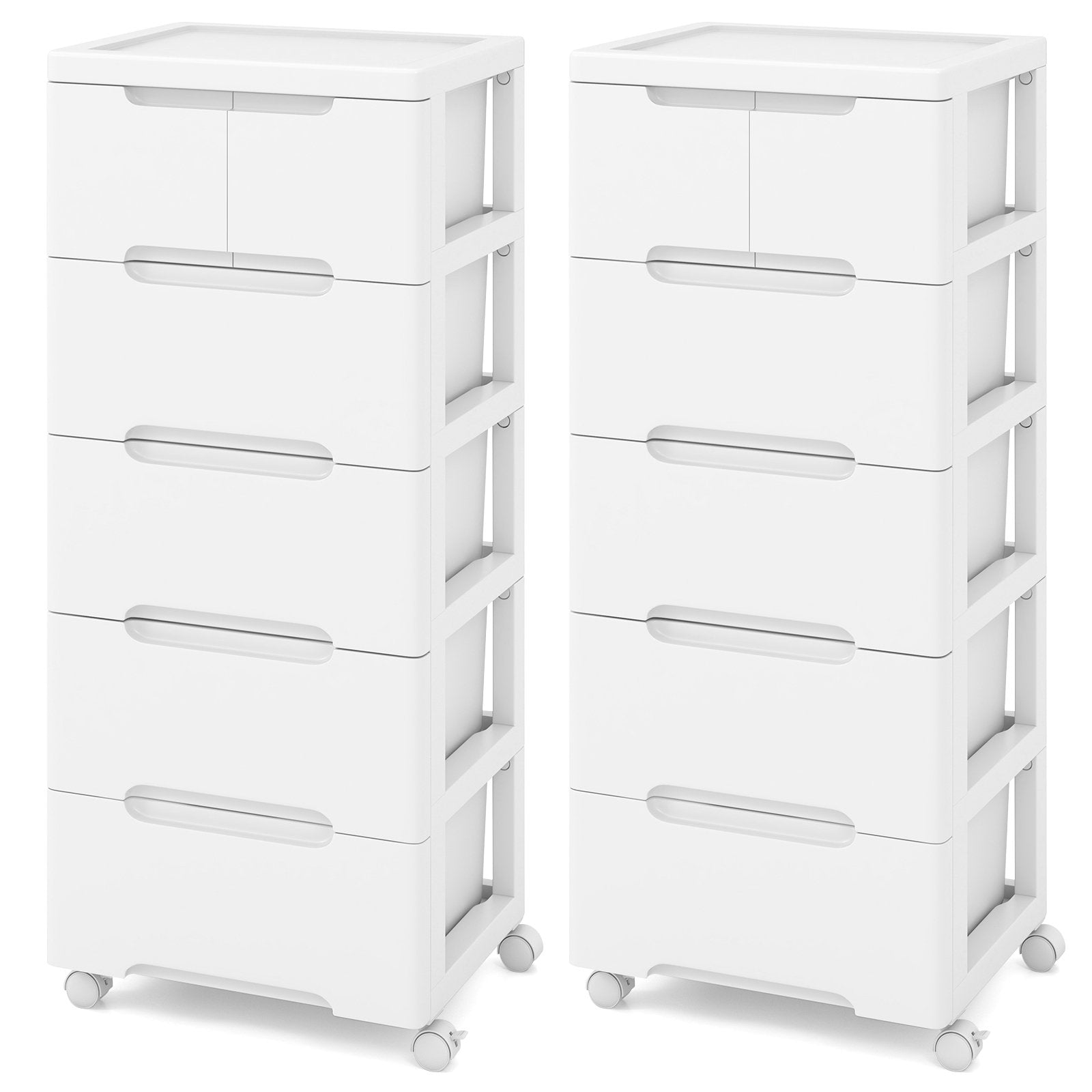 Crafted from PP material, the rolling storage cabinet features a spacious cabinet top, which provides a perfect space for showcasing decorations, and 5 drawers for versatile storage solutions. With smooth universal wheels for easy mobility, 2 of which are lockable for stability, this storage organizer effortlessly moves around your home. Its varied drawer sizes are perfect for storing art supplies, kitchen gadgets, and office essentials, making it adaptable to your needs. Resistant to stains and lightweight yet long-lasting, this storage unit promises a long service life. The tool-free assembly, with interlocking components for quick setup, ensures a hassle-free experience without the need for any hardware. Bullet Point: Ideal Storage Solution: Keep your home clutter-free with the rolling storage unit that features a combination of wide cabinet top and 5 drawers. It is perfectly tailored to store your books, magazines, snacks, toys, or toiletries. Please close the drawers timely to avoid tipping. Mobile Convenience: Equipped with smooth, universal wheels, the mobile storage organizer easily glides from room to room. And 2 lockable wheels add stability when stationary, offering the perfect blend of mobility and security. Exceptional Versatility: Whether it's art supplies, kitchen gadgets, office essentials, or bath products, the storage cart adapts to your needs. The varied drawer sizes help you build your own storage system for kids room, studio, home, office, and more. Long-Lasting Material: Crafted from superior PP, the storage cabinet promises ideal durability. Lightweight yet sturdy, it holds up well against the rigors of daily use, making it an enduring and stain-resistant choice for your space. Tool-Free Installation: The storage organizer boasts a tool-free assembly, featuring interlocking components that easily snap together without the need for any hardware, enabling a quick and effortless setup.