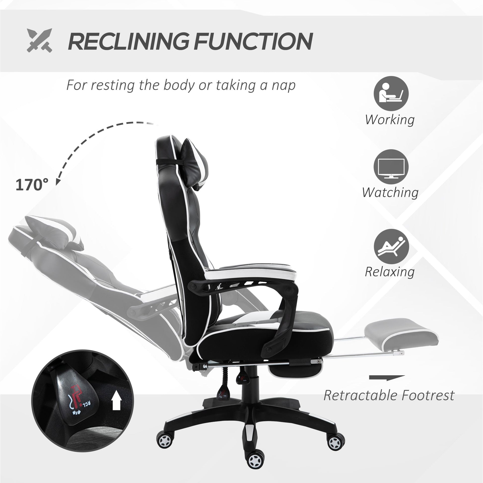 Fulfil your need for some serious style with this gaming chair with footrest from Vinsetto. It's fitted with thick sponge for comfort and wrapped in sleek faux leather with contrasting panels. Comfortable in design, it features a high back, armrests, a five-wheel base and can swivel around 360°. Whether it's work or play, the gaming chair for adults is a good choice.