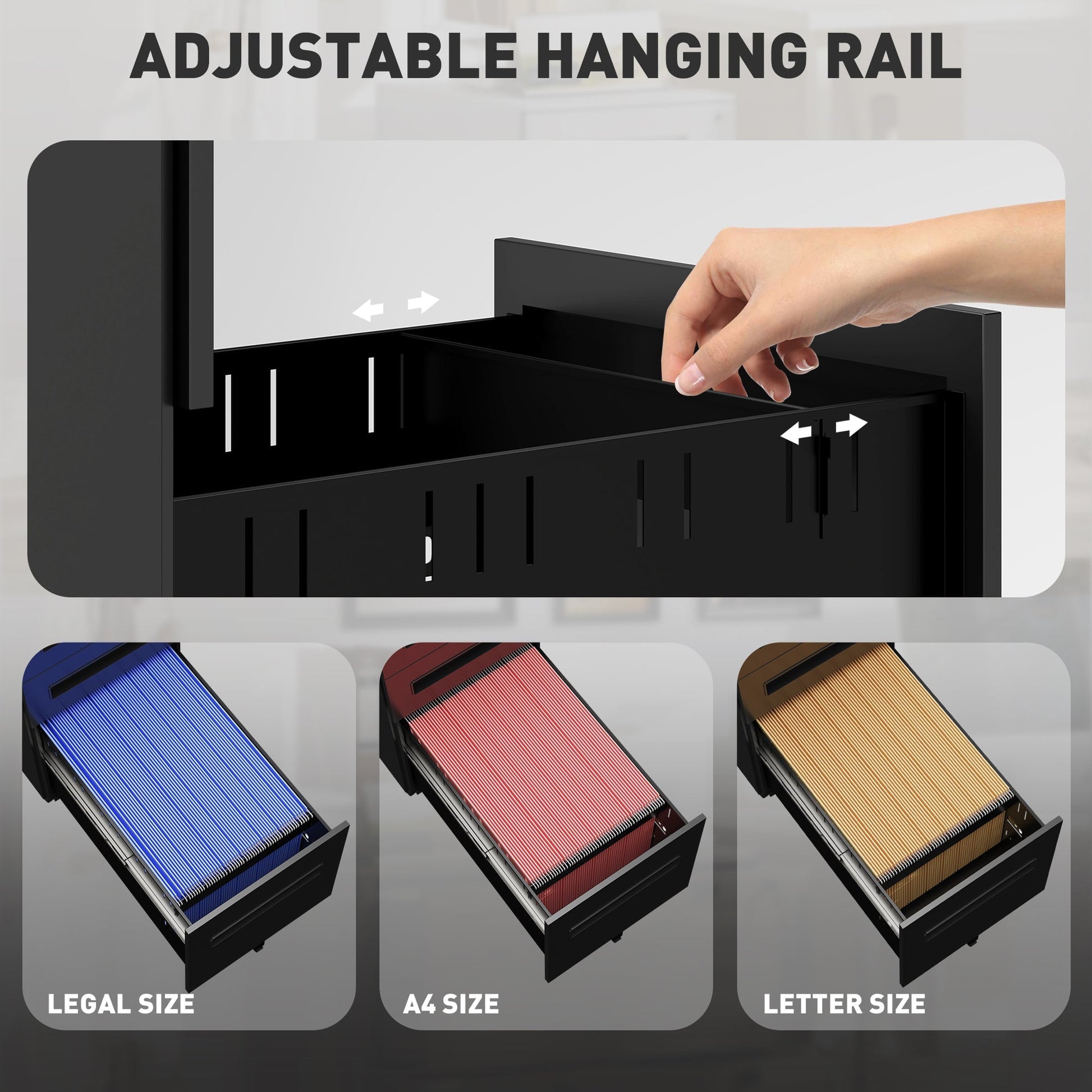 - Adjustable hanging rail in large drawer for three file sizes