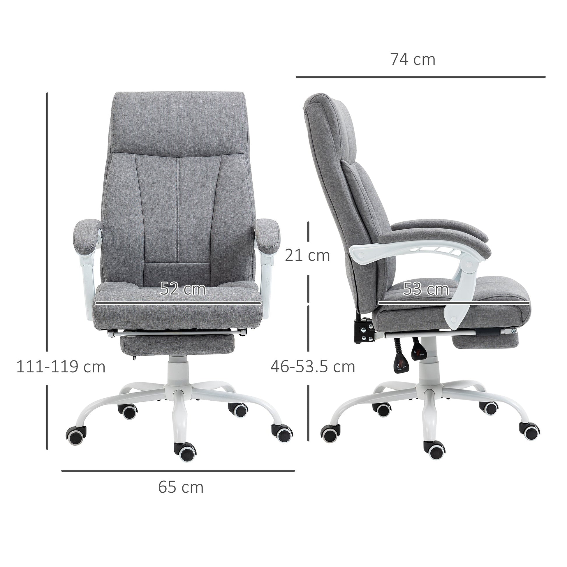 Your long work day calls for this Vinsetto office chair. Relax and recline into an angle you want, thanks to the 155 reclining back and manual footrest. Thick padding for comfort, the linen-look upholstery is soft on skin. Adjust the height between 111cm and 119cm: set to a working level best for you. Comfort and functionality - this home office desk chair does both.