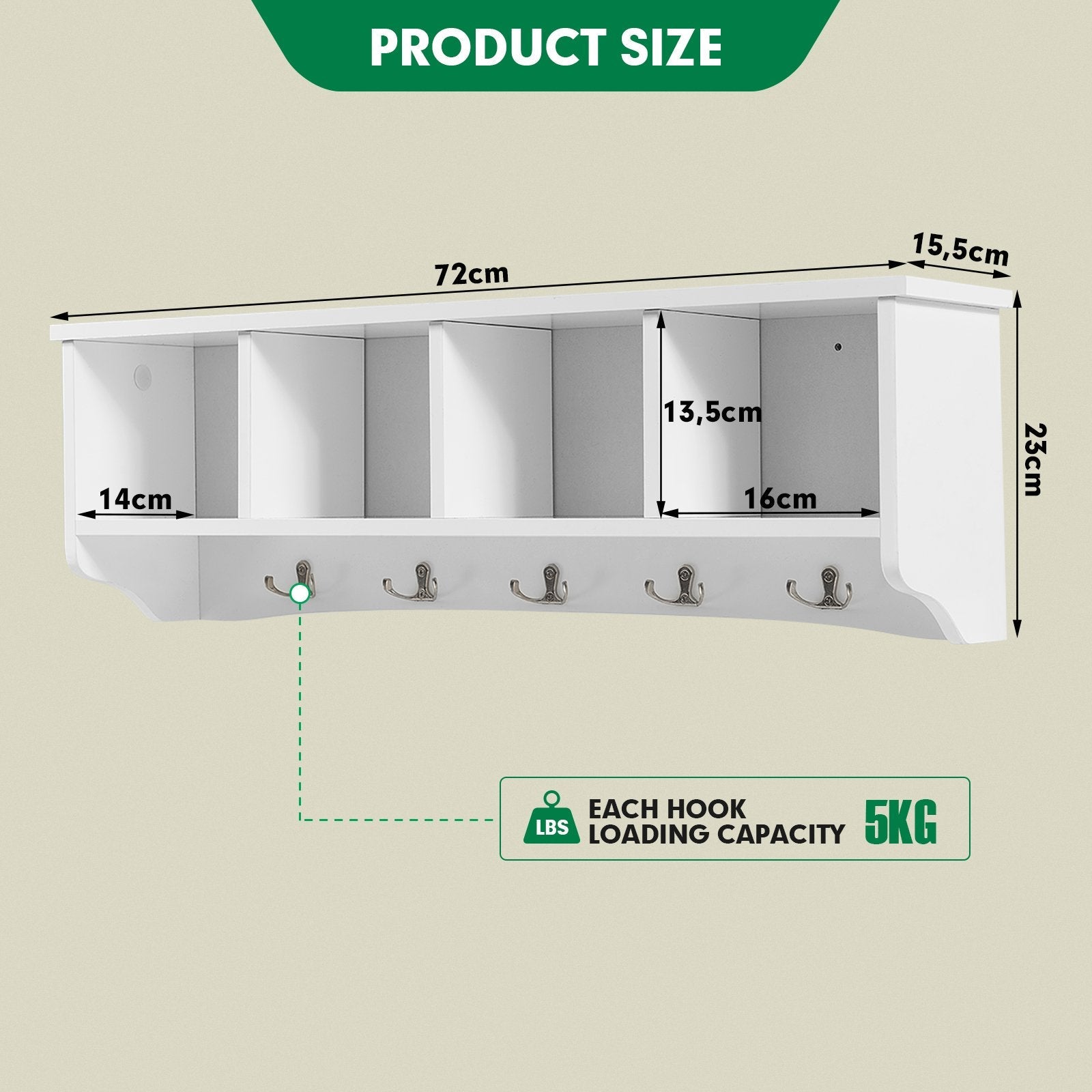 Are you finding a wall-mounted cabinet to enlarge your storage space? This practical storage cabinet is a good choice for you. There are also four compartments for storing your sundries and five hooks to hang your coat, key and umbrella. Made of hard density board, the structure of cabinet is sturdy for durable use. Designed in modern and concise style, the storage cabinet is perfect to suit for any kind of decoration of living room, kitchen, bedroom or bathroom. What’s more, this set not only provides functional storage but also doesn’t take up your valuable floor space. After receiving the parcel, the cabinet is easy to assemble according to the instructions and all required accessories by yourself. Sturdy and Durable Structure: Made of premium density board, the sturdy frame gives this wall-mounted cabinet sleek design and can be used for long time. The whole structure is not easy to deform. In addition, the surface of cabinet is painted with special coating which is scratch-resistant and waterproof. Enough Storage Space: Four compartments offer space for your books, bottles and other accessories. Different kinds of things can be sorted in these four compartments for easy taking. In addition, the storage cabinet is equipped with five hooks for hanging your bags, coats and umbrellas. Space-Saving Design: This storage cabinet with smart design can be mounted on the wall to save your precious space. The dimension of storage cabinet is 28.5 x 6 x 9 Inches. And the weight of cabinet is not too heavy so that you can mount the storage cabinet conveniently in your hallway, kitchen or bedroom. Concise and Modern Style: Without too much elaborate ornamentation, the cabinet is designed in concise and contemporary style. Not only the storage cabinet is suitable for different style of decoration but also it provides a place for taking things conveniently. Easy to Install and Maintain: The cabinet comes with an installation manual and all required accessories. It is easy to install by yourself in a short time. With waterproof and scratch-proof surface, the shelf is very easy to clean with wet cloth.