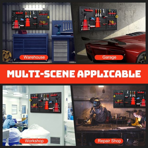 Colour: Black, Red Material: Steel Overall dimension: 120 x 60 x 2.5 cm (L x W x H) Single pegboard size: 60 x 40 x 2.5 cm (L x W x H) Net weight: 6.5 kg Weight capacity of each pegboard: 20 kg Weight capacity of drill bit storage rack: 1 kg Weight capacity of each wrench set rack: 1 kg Weight capacity of each tool holder: 1 kg Weight capacity of each long rack: 5 kg Weight capacity of each hook: 5 kg Package includes: 3 x Pegboards 1 x Drill bit storage rack 2 x Wrench set racks 4 x Tool holders 2 x Long racks 8 x Short pegboard hooks 8 x Long pegboard hooks 1 x Instruction manual