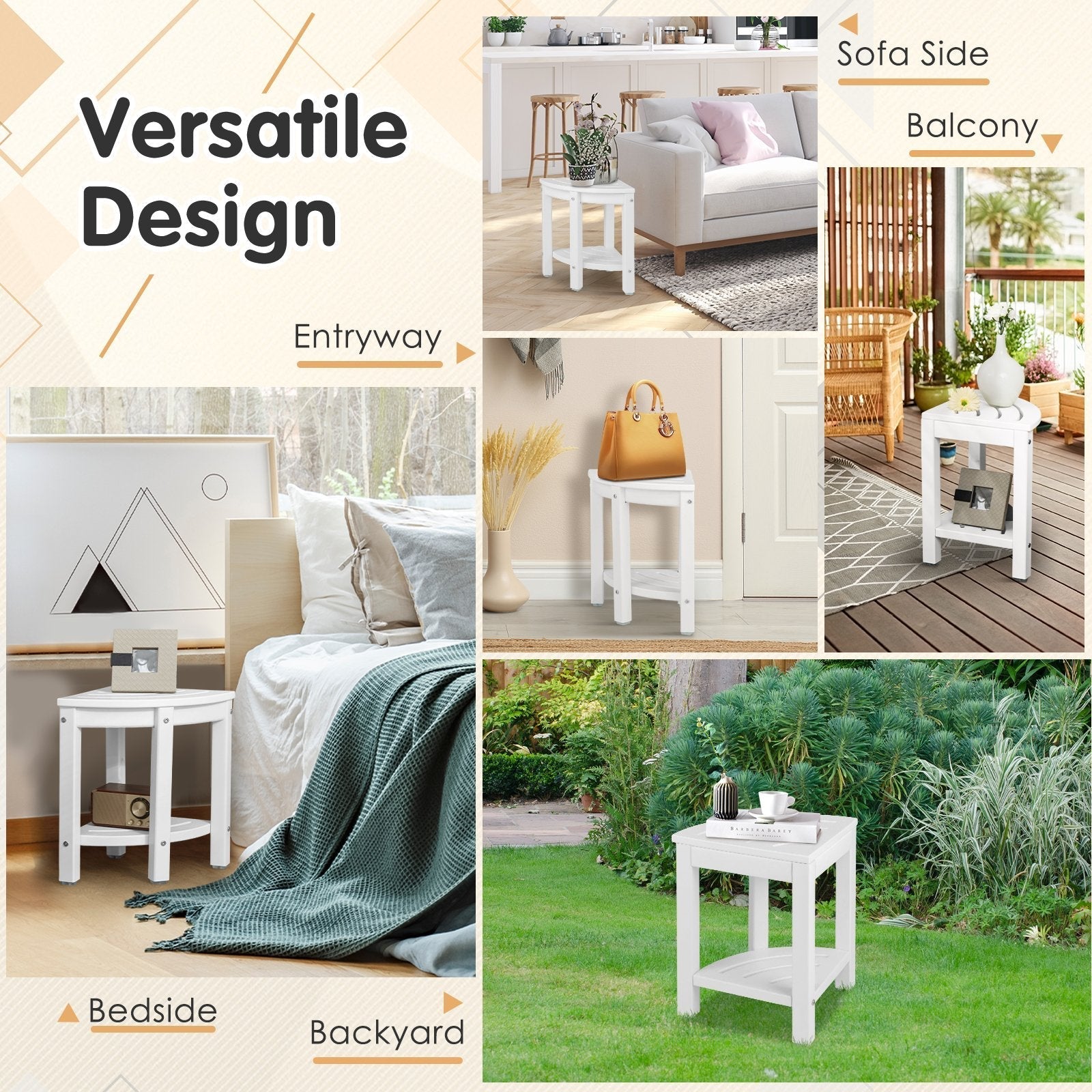 Made of premium HDPE material, this shower stool is waterproof, moistureproof and anti-fading, which not only can withstand long term use in bathroom or shower room but also saves your time and money to maintain. The smooth surface is carefully crafted to ensure no burrs.Built with a storage shelf, this corner shower effectively increases the space efficiency of small spaces, suitable for bathroom, shower room, sofa side, bedside, etc. Also, the corner seat is capable for outdoor use, such as balcony, garden, patio and more. The heavy-duty construction can hold weight up to 300 lbs. And the non-slip foot pads offer increased stability. If you are looking for a shower stool like this, do not hesitate to place an order! 100% Waterproof HDPE Material: This corner shower stool is made of high density polyethylene material which is high hardness, waterproof and moldproof, ideal to be used in bathroom or shower room. With exquisite workmanship, the smooth surface has no burrs and is comfortable to touch. Zero Maintenance and Wide Application: The seat is crafted with drainage slots which avoid water accumulation during and after using. This anti-fading HDPE shower bench won’t need any hassle maintenance comparing to wooden or bamboo shower benches. You can use this bench for both indoor and outdoor use, suitable for bathroom, bedside, sofa side, entryway, etc. Space-Saving Stool with Storage: The 90° design makes this bathroom foot rest right for the corner of toilet, bathroom, shower room and more, which is perfect a shaving stool or a corner stool with storage shelf for small spaces. The smooth and curve top is able to prevent collision and scratching. 330 LBS Weight Capacity: This corner shower bench features a super heavy-duty construction with a net weight of 5 kg. And the weight capacity is as high as 150 kg. The non-slip rubber foot pads can keep the shower bench still when you are sitting or shaving legs on it. Easy Assembly and Product Dimension: This corner shower stool comes with understandable instructions and required accessories. So the assembly is no longer troublesome. Product dimension: 32 cm x 32 cm x 43 cm (L x W x H). Height of storage shelf: 25 cm.