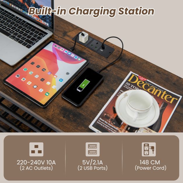 Colour: Brown/Grey Material: Engineered Wood, Metal Overall Dimension: 120 x 40 x 92cm (L x W x H) Countertop Dimension: 120 x 40 cm (L x W) Net Weight: 20 kg Load Capacity of Countertop: 100 kg Load Capacity of Middle Shelf: 50 kg Load Capacity of Bottom Shelf: 40 kg AC Outlets: 220-240V/10A USB Ports: 5V/2.1A Power Cord Length: 148cm Hold Capacity of Wine Racks: 21 bottles Hold Capacity of Wine Glass Racks: 8 glasses Package includes: 1 x Wine Rack 1 x User Guide
