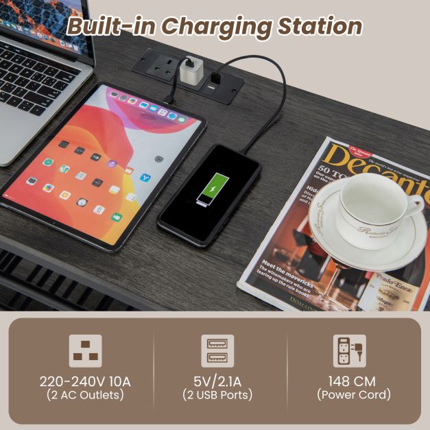 Colour: Brown/Grey Material: Engineered Wood, Metal Overall Dimension: 120 x 40 x 92cm (L x W x H) Countertop Dimension: 120 x 40 cm (L x W) Net Weight: 20 kg Load Capacity of Countertop: 100 kg Load Capacity of Middle Shelf: 50 kg Load Capacity of Bottom Shelf: 40 kg AC Outlets: 220-240V/10A USB Ports: 5V/2.1A Power Cord Length: 148cm Hold Capacity of Wine Racks: 21 bottles Hold Capacity of Wine Glass Racks: 8 glasses Package includes: 1 x Wine Rack 1 x User Guide
