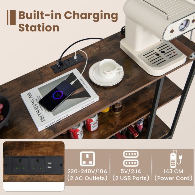 Color: Brown/Black Material: Engineered Wood, Metal Overall Dimension: 113 x 35 x 85cm (L x W x H) Coutertop Dimension: 113 x 35 cm (L x W) Net Weight: 18.5 kg Load Capacity of Countertop: 100 kg Load Capacity of Middle Shelf: 50 kg Load Capacity of Bottom Shelf: 40 kg AC Outlets: 220-240V/10A USB Ports: 5V/2.1A Power Cord Length: 143cm/ 4.7FT Hold Capacity of Wine Racks: 15 bottles Hold Capacity of Cup Racks: 6 cups Package includes: 1 x Wine Rack 1 x User Guide