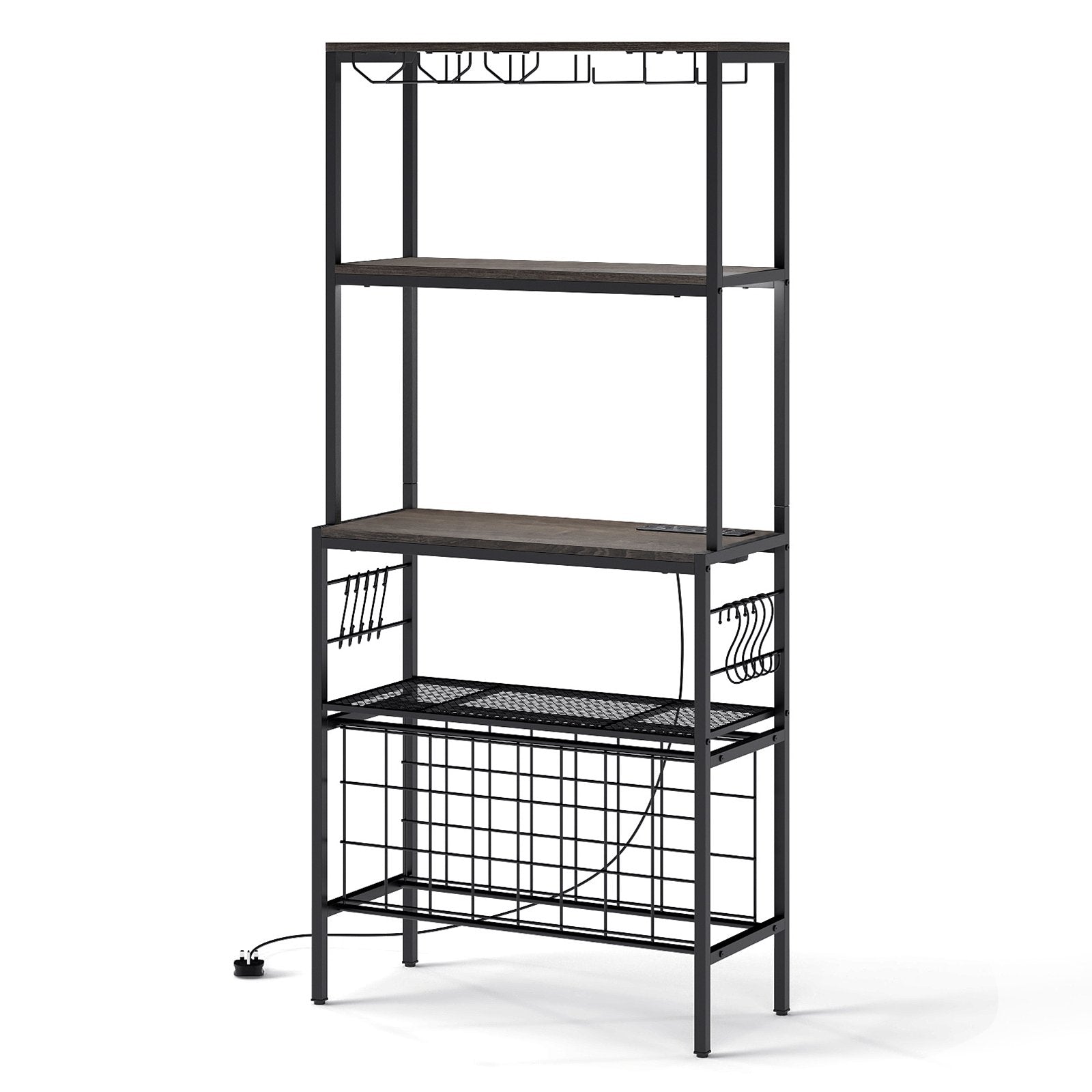 This exquisite storage rack includes a built-in power strip for convenient device charging. It also features 4-tier sufficient storage space, plus specialized sections for 24 wine bottles, 9 stemware glasses and 9 mugs. Enhanced with a reinforced metal frame and designed with an industrial aesthetic, the wine rack with well-crafted details brings not only utility but also a sleek allure to your kitchen or home bar. Elevate your home's functionality and style with this essential addition! Built-in Power Strip: This wine organizer features a built-in power strip with 2 240V/13A AC outlets, a 5V/2.4A USB port, and a Type-C port. The power outlet makes it convenient to charge kitchen appliances or electronic devices. Extensive Storage Capacity: Equipped with 3 wooden shelves and a mesh metal shelf, this multi-tier baker's rack offers ample space for a microwave, coffee machine, dinnerware and kitchenware. It also includes 8 side hooks for hanging utensils, towels, or cups. Perfect for Wine Enthusiasts: Designed to support your wine collection, this storage shelf boasts 3-tier wine rack that can hold 24 bottles. The top features 3 rows of wine glasses and 3 rows of mug racks, hanging up to 9 stemware glasses and 9 mugs, ensuring your bar essentials are stylishly displayed and within reach. Reinforced Metal Frame: Constructed with a heavy-duty metal frame that resists deformation, this wine rack ensures longevity and stability. Adjustable foot pads and anti-tipping device offer added assurance and safety. Appealing Home Addition: With industrial aesthetic and simple-to-clean surface, this home organizer is perfect kitchen, living room, or home bar. Moreover, the 6" clearance away from the floor makes cleaning much easier.