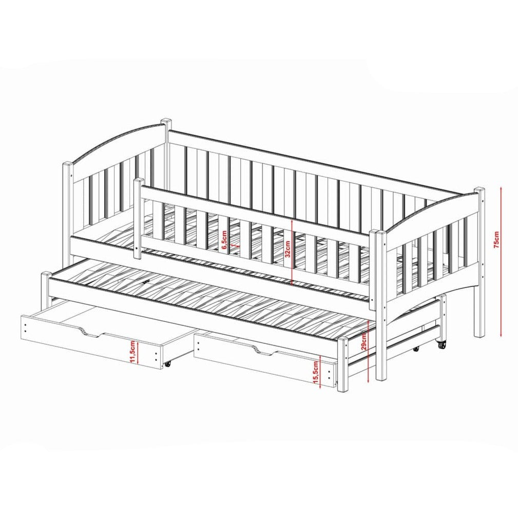 Discover the Amelka Double Bed with Trundle, crafted from solid pine wood and available in multiple colours, perfect for your child's bedroom storage needs!