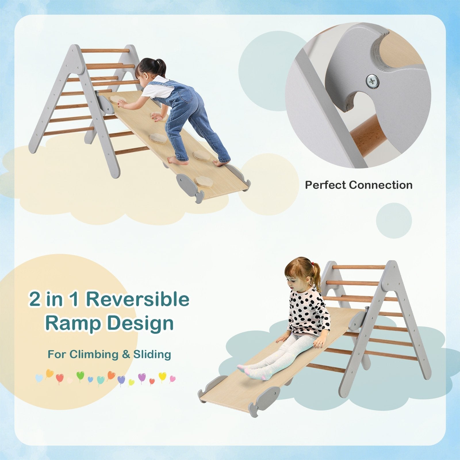 Wooden Triangle Climbing Ladder Set with 2-in-1 Reversible Ramp-Grey