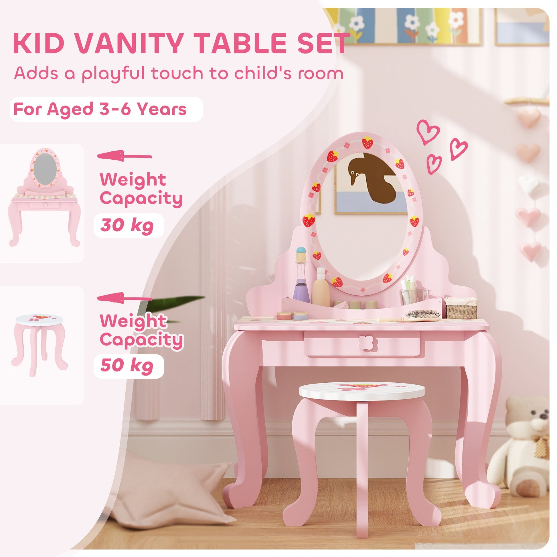 Zestaw toaletkowy dla dzieci AIYAPLAY, toaletka ze stołkiem, lustro, szuflada, schowek na biurko, motyw truskawkowy, różowy
