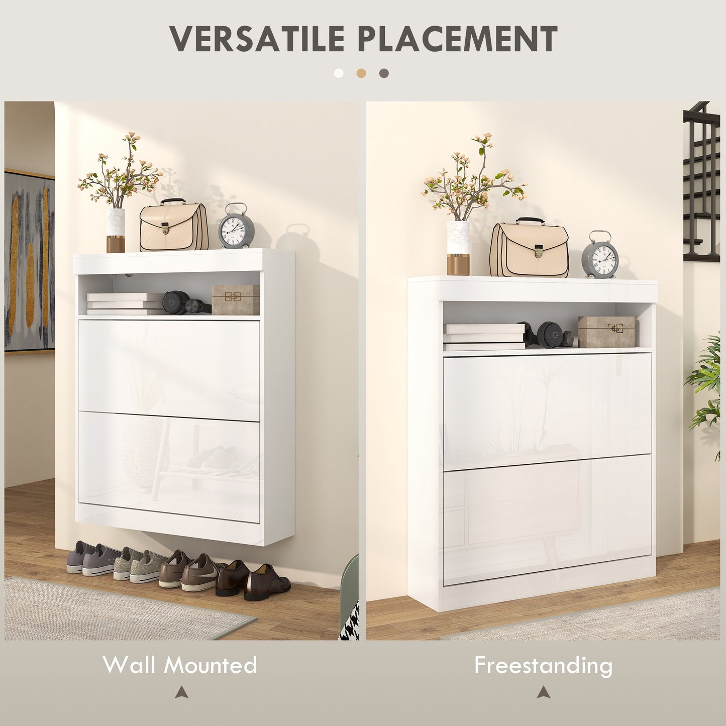 Whether wall-mounted or used freestanding, this HOMCOM shoe cabinet is here to keep footwear stored together and out of sight. Made from particle board for sturdiness, shoe storage cabinet comes with two flip drawers - holds 12-16 shoe pairs, maximum size UK 8.5; easily adjust the shelf between two different positions for differently-sized footwear. Complete with a top shelf which is ideal for keeping keys, letters and similar items.