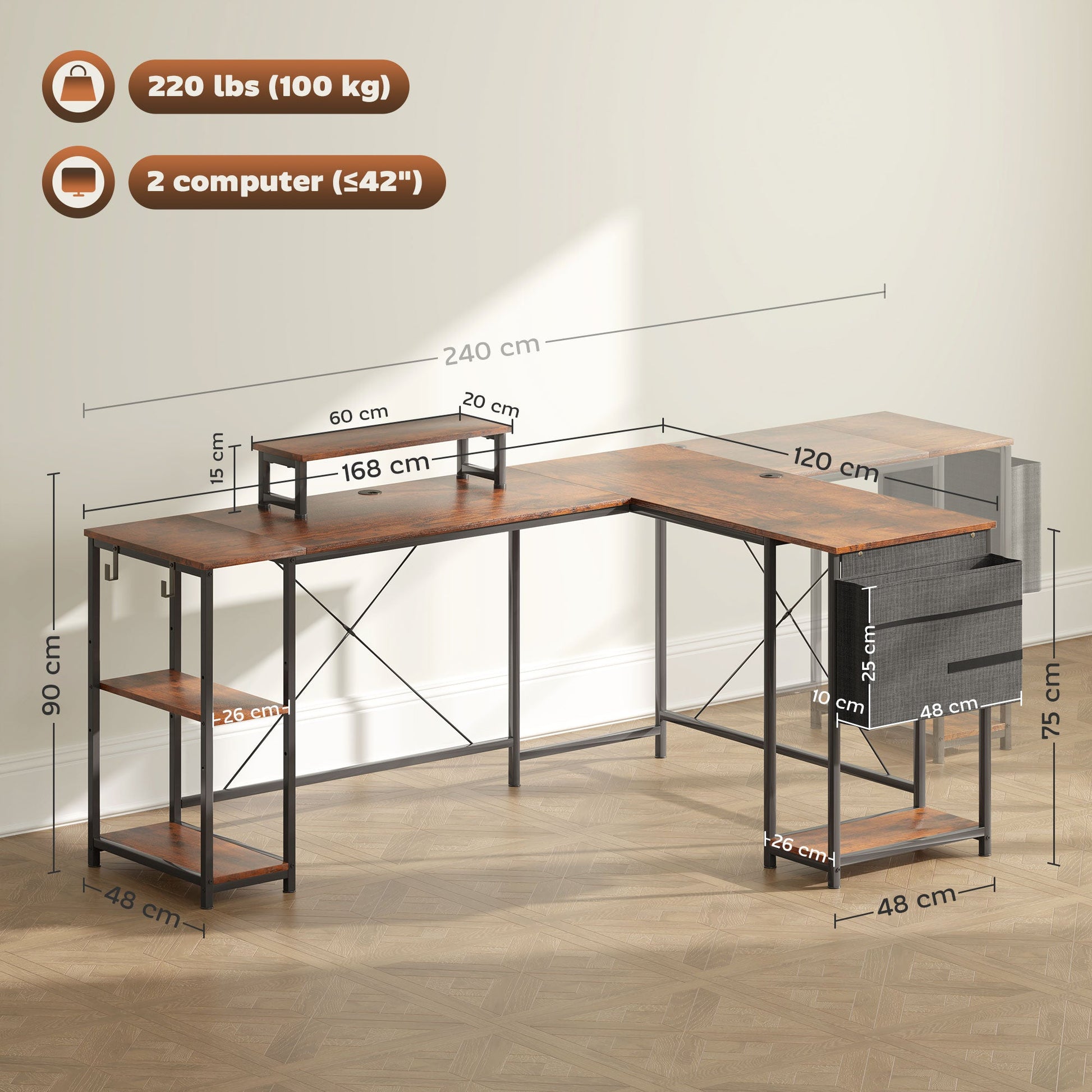 HOMCOM 168cm Biurko w kształcie litery L, odwracalne, industrialne biurko komputerowe narożne z regulowaną półką i torbą do przechowywania, 240cm Biurko dla 2 osób z podstawką pod monitor, rustykalny brąz