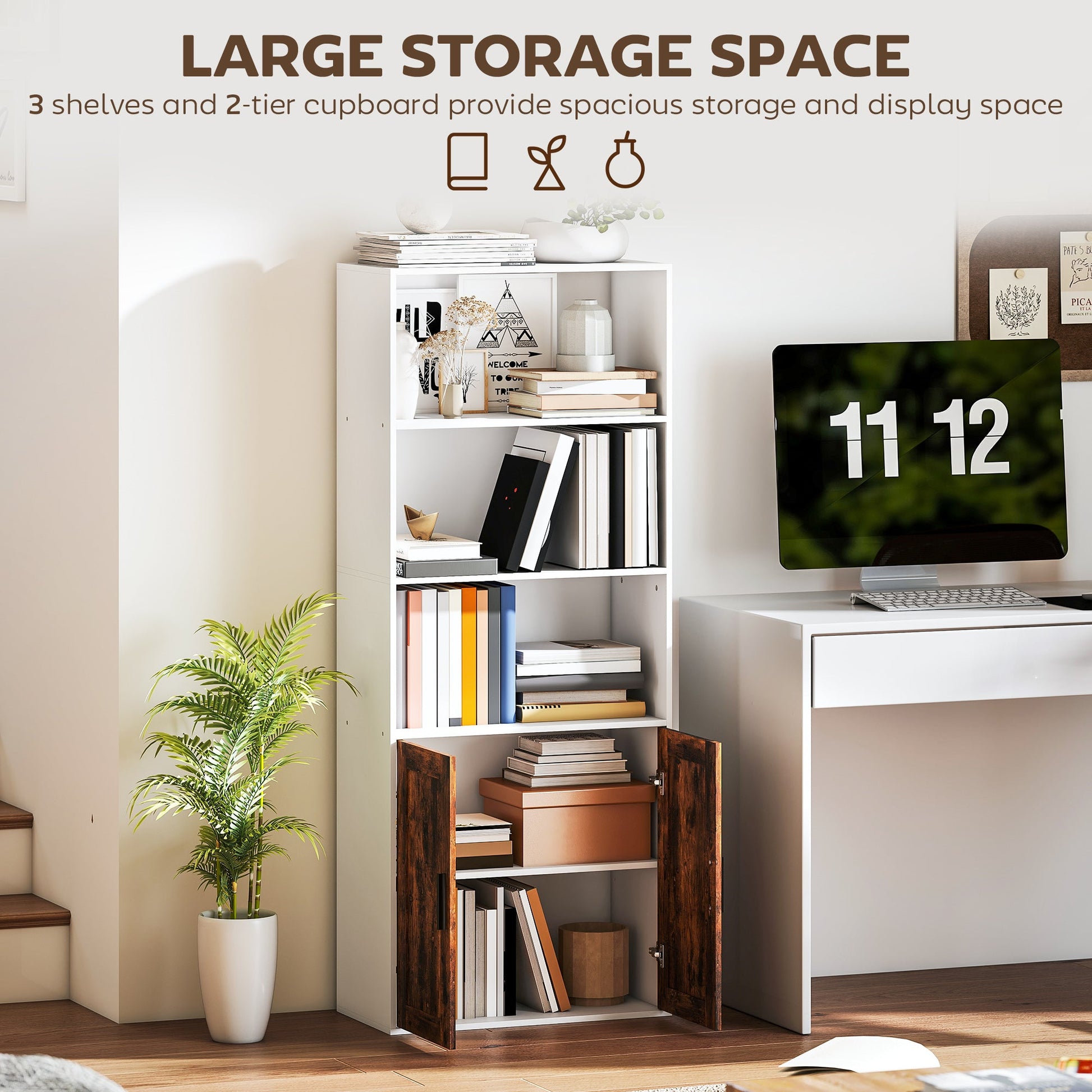 Transform your space with the HOMCOM bookcase, designed for both style and practicality. Struggling with clutter? Its open shelves and enclosed storage offer versatile organization for books, decor, or plants. Worried about safety? Anti-tip kit ensures stability, great for homes use. Need flexibility? Adjustable shelves accommodate items of all sizes, creating a tidy, personalized space for your home or office.