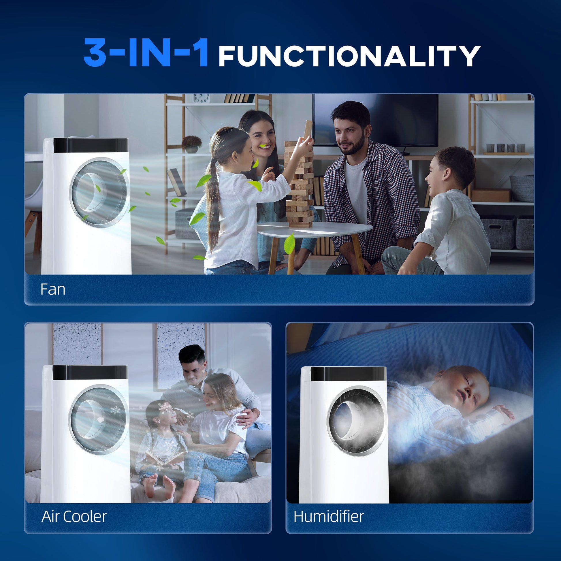 Poczuj świeższy powiew dzięki wentylatorowi HOMCOM Air Cooler Fan, konstrukcji bez łopatek, która zapewnia bezpieczeństwo młodym członkom i zwierzętom domowym, a także łagodniejszy przepływ powietrza. To wszechstronny wentylator z trzema funkcjami: wentylator chłodzący powietrze z dwoma wkładami chłodzącymi i nawilżaczem, co czyni go doskonałym wyborem do Twojego domu. Ciesz się spersonalizowanym komfortem dzięki trzem trybom i prędkościom, oszczędzając jednocześnie energię w porównaniu z tradycyjnymi klimatyzatorami.