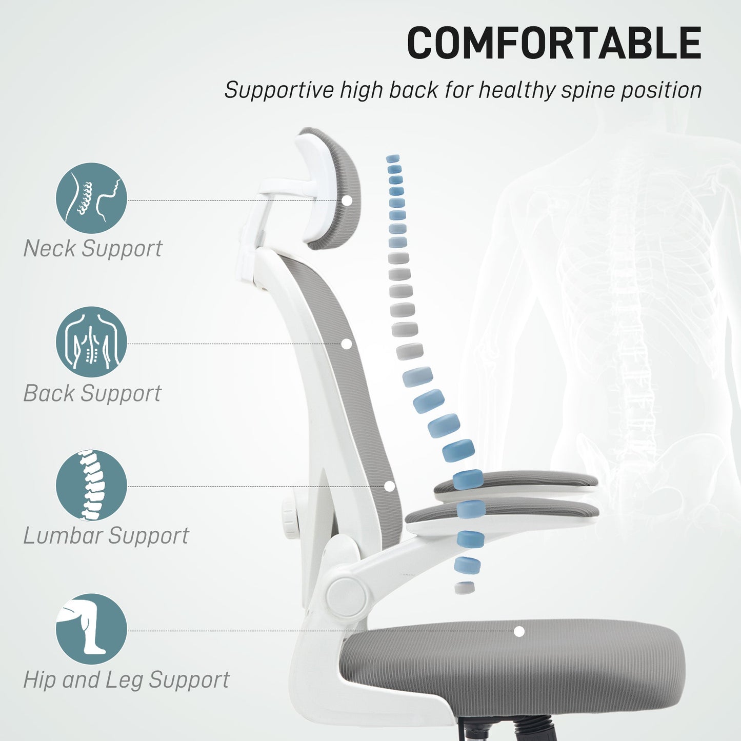 Fotel biurowy HOMCOM Executive, ergonomiczny fotel biurowy z wysokim oparciem i siatką, podnoszonymi podłokietnikami, obrotowym zagłówkiem, regulowanym podparciem lędźwiowym, obrotowy fotel komputerowy do nauki w domu, szary