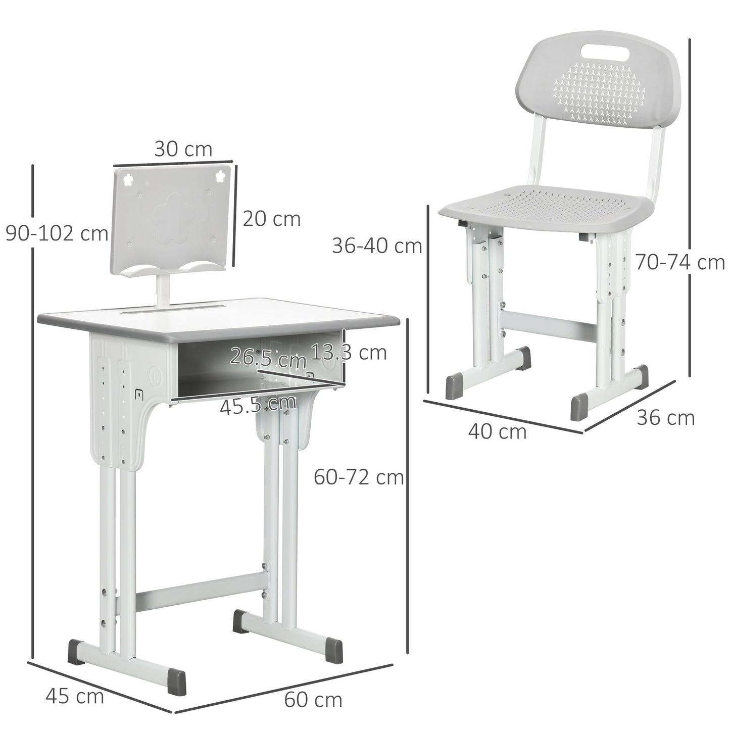 Zestaw HOMCOM Kids z regulowanym biurkiem i krzesłem, stojakiem na książki, miejscem na długopisy - szary