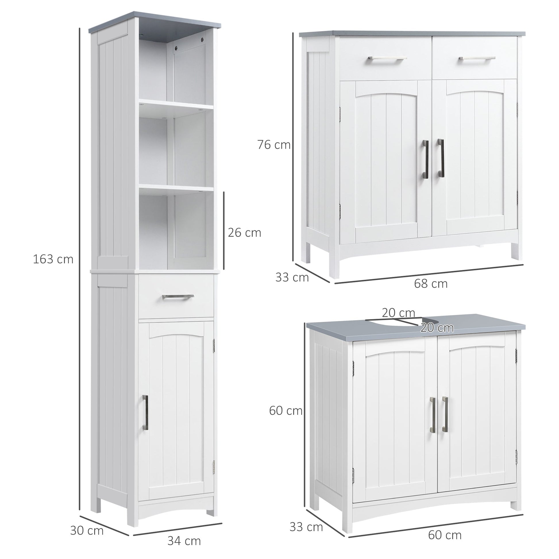 Transform your bathroom with the kleankin bathroom furniture set. Offering extra storage space for tidying up cleaning supplies and an adjustable shelf to accommodate all shapes and sizes, this elegant bathroom unit complements any bathroom decor. Crafted from MDF, it promises enduring charm and practicality with a 'U' shaped cut-out to neatly fit under most sinks.
