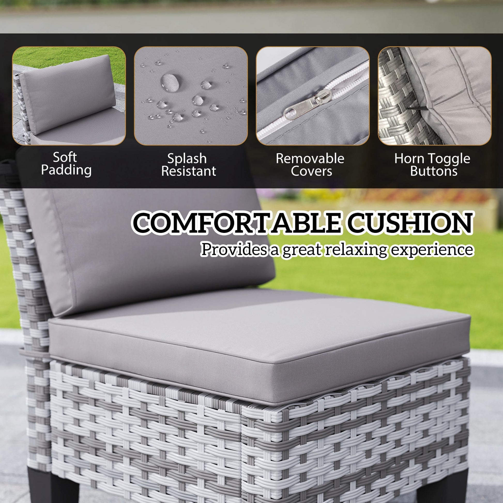Zestaw mebli ogrodowych Outsunny z rattanu, 7 elementów, 6-osobowy zestaw mebli ogrodowych z wikliny z poduszkami na siedziska i oparcia, otwór na parasol, stół tarasowy i krzesła z metalowym blatem z listew na balkon, szary