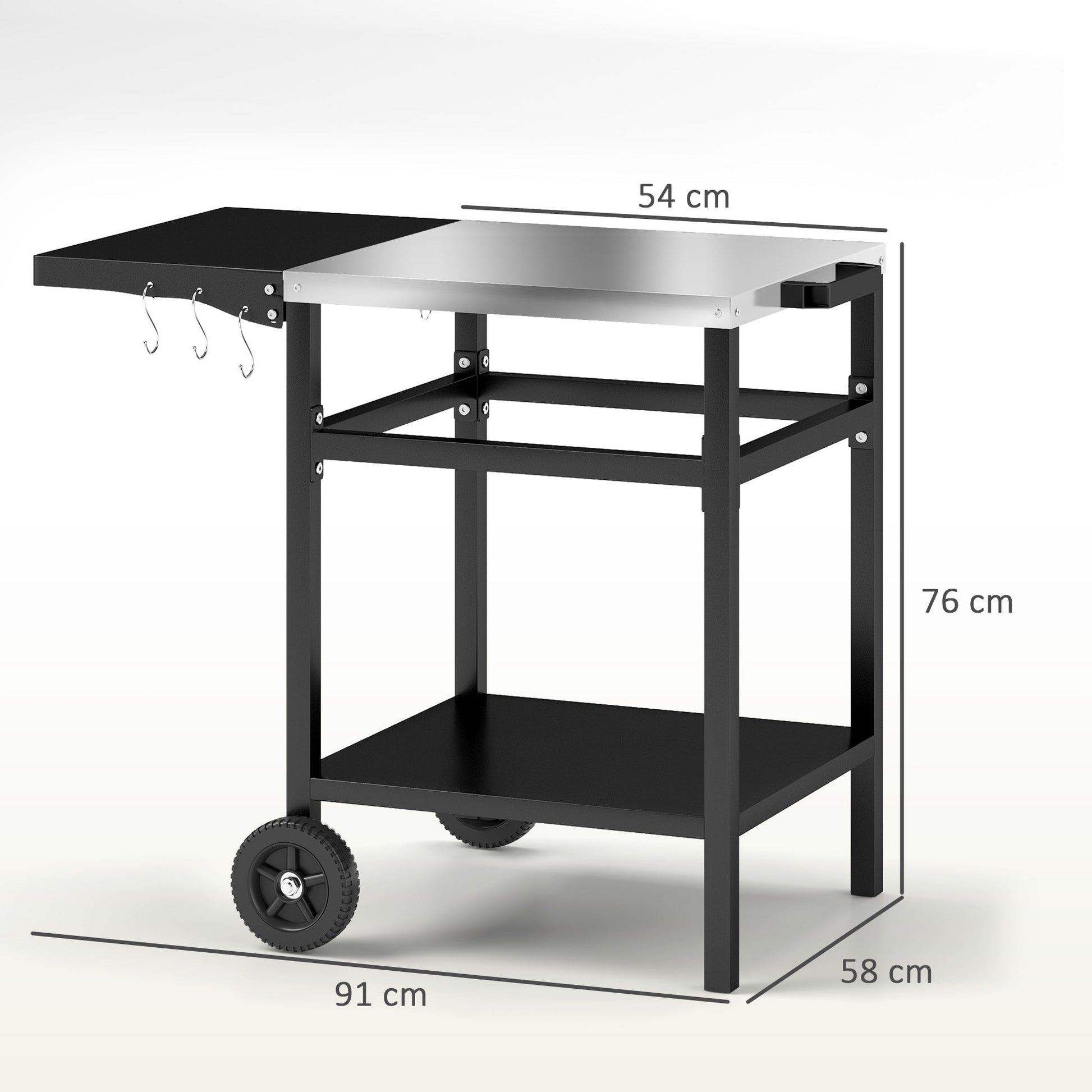 Wózek do grilla Outsunny z blatem ze stali nierdzewnej i składanym stolikiem bocznym, zewnętrzna stacja do grillowania z haczykami i półką, stół do pieca do pizzy, ruchomy zewnętrzny wózek do grillowania z pokrywą, czarny