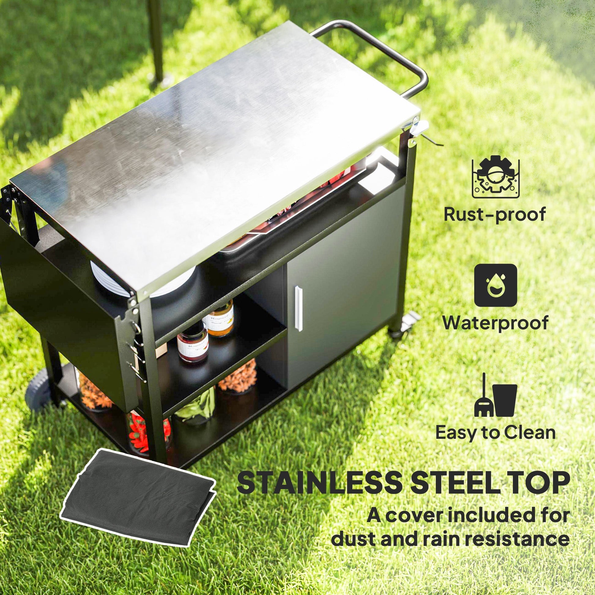 Wózek do grilla Outsunny Outdoor BBQ Trolley ze składanym stolikiem bocznym, blat ze stali nierdzewnej, kuchnia zewnętrzna z kółkami, wieszakami, półkami, szafką, stół do pieca do pizzy, ruchomy wózek do grilla zewnętrznego z pokrywą, czarny