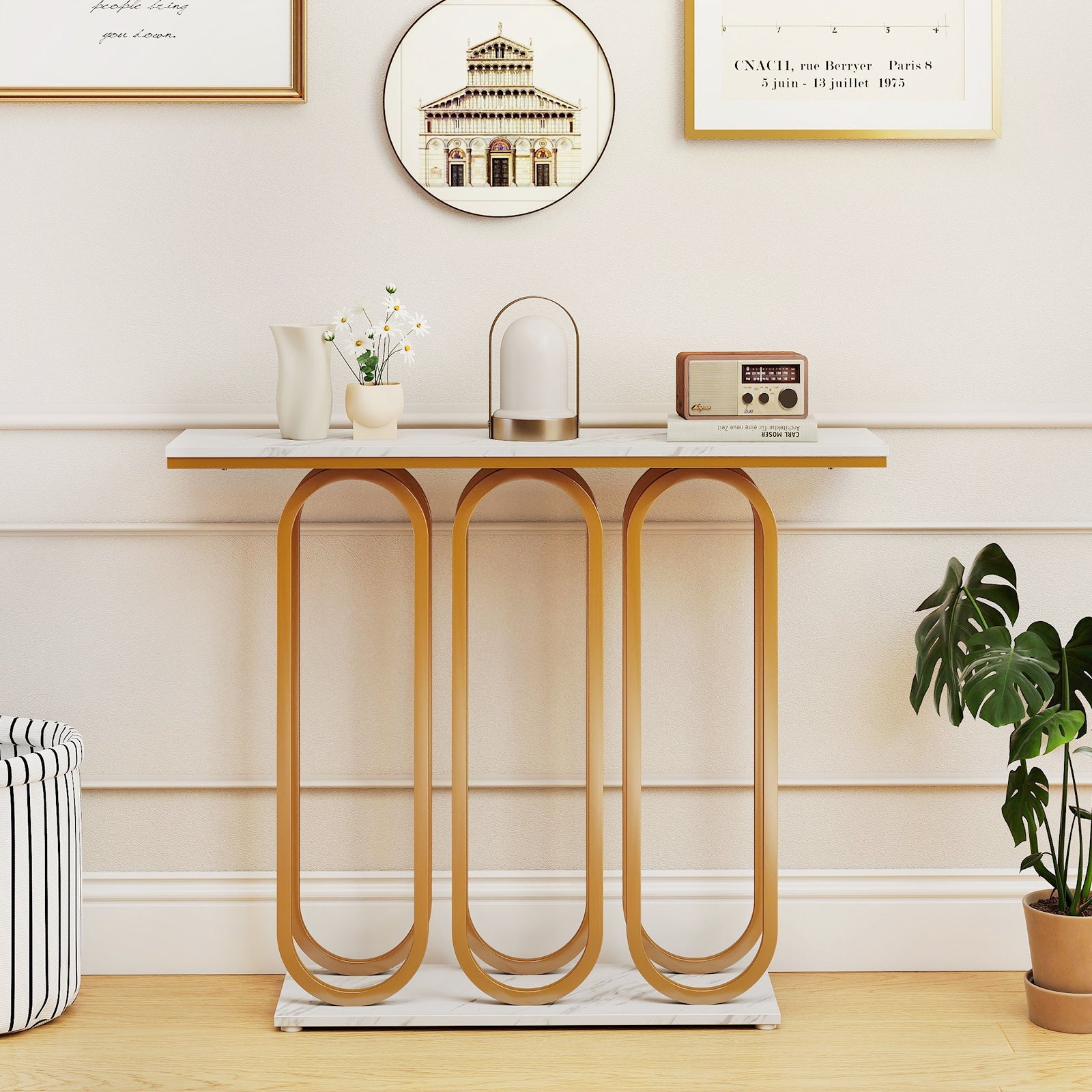 Introducing this faux marble console table, a stylish and practical storage solution for your space. With its spacious 100 x 30 cm (L x W) tabletop, you can effortlessly display and organize books, photos, snacks or decorations. Crafted with durable thickened MDF and metal tubes, this entryway table can withstand long-term use, boasting a remarkable load capacity of up to 75 kg. Say goodbye to wobbles, safety is ensured with anti-tipping kits and an enlarged base featuring adjustable foot pads for added stability. The faux marble textures on the tabletop exude elegance, while the unique oval metal frame structure sets it apart from ordinary console tables. Installation is a breeze with the included manual. More, its burr-free surface makes cleaning and maintenance a breeze. Elevate your space with this elegant and convenient faux marble console table. Ideal Storage Spot: The console table features a 100 x 30 cm (L x W) tabletop to offer plenty of room to display your books, photos, snacks or decorations. Thus, you can easily keep your space look organized and clutter-free. Strong Construction: Crafted of thickened MDF, the entryway table resists cracks for the long-term use. Together with its metal tubes, its overall load capacity is enhanced up to 75 kg, which can perfectly satisfy your daily use. Anti-Tipping Safety: For added stability, the foyer table contains anti-tipping kits that achieve firm attachment to the wall. Also, it boasts an enlarged base with adjustable foot pads, keeping the console table wobble-free. Elegant Ambiance: Faux marble textures cover the top, exuding the elegant charm. Meantime, the entryway table comes with a stylish structure that consists of several oval metal frames, making it stand out from the ordinary console table. Easy to Install and Maintain: Say goodbye to complicated assembly. The console table is equipped with a detailed manual to offer clear guidance and help you finish the easy installation. Also, its burr-free surface is low-maintenance, making cleanup easier.