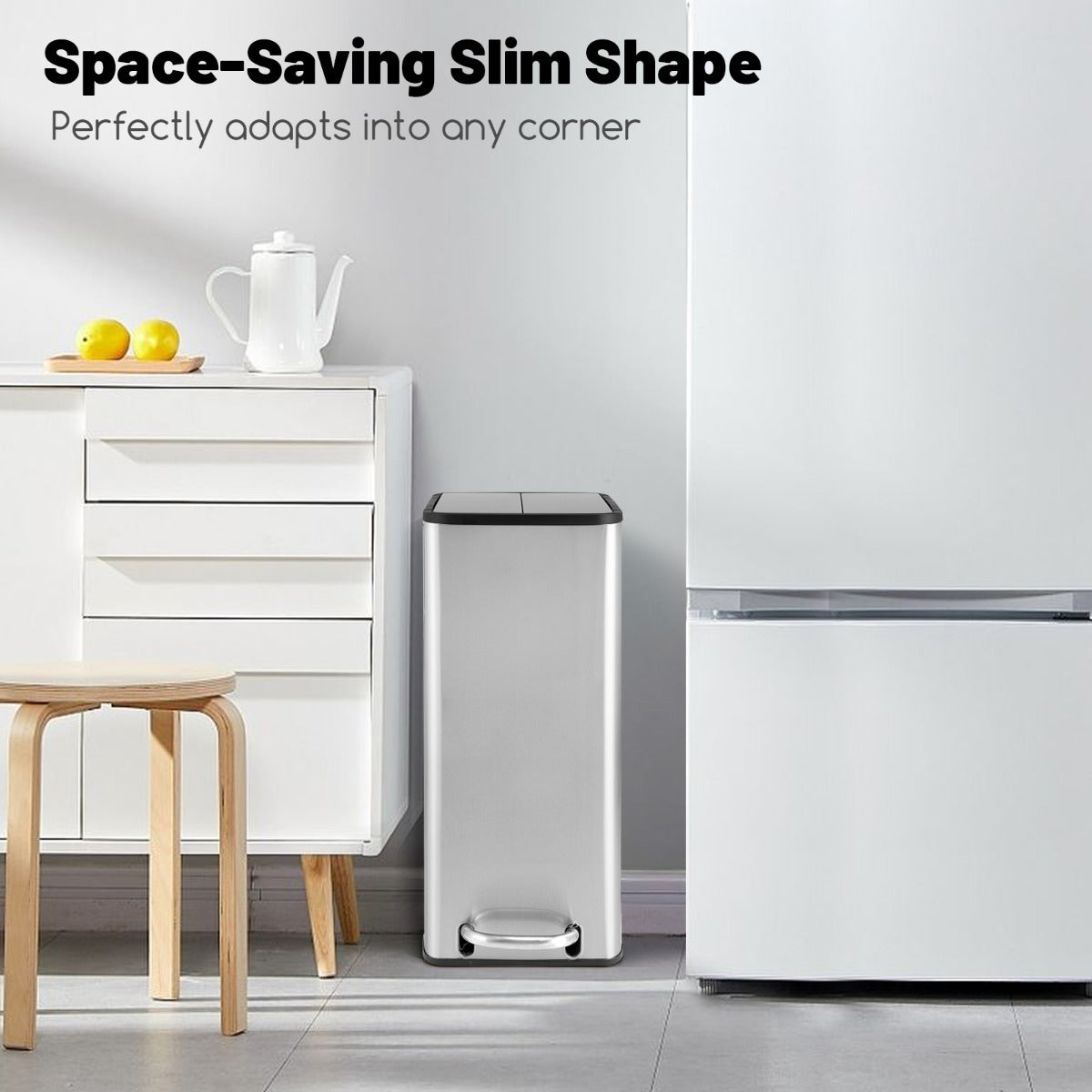 '-The stainless steel structure features a 3-layered design -With a soft-closing design that is low-noise and much safer -Lids swing open centrally for easy access under a low countertop -Achieves a hand-free operation thank to the convenient pedal -The well-made lids are well-sealed to block unpleasant smells -Removable inner bucket has hidden handles for easy removing -Versatile stainless steel trash can for kitchen, living room, and office -Exterior side handles make it more convenient to move -Anti-slip foot pads protect the floor from being scratched -Features convenient pedals to achieve hand-free operation -Space-saving slim shape perfectly adapts to any corner -Waterproof and stain-proof surface is easy to clean