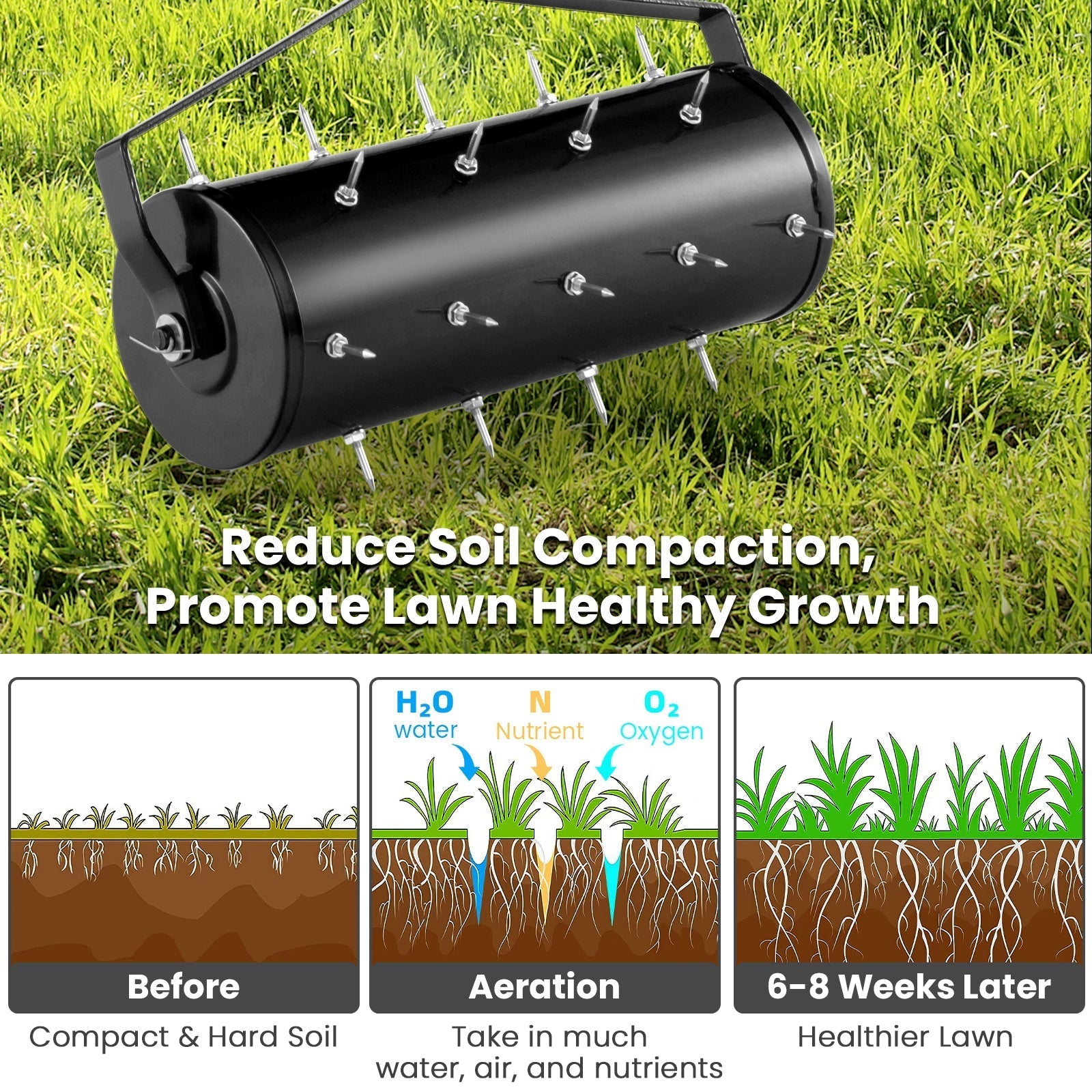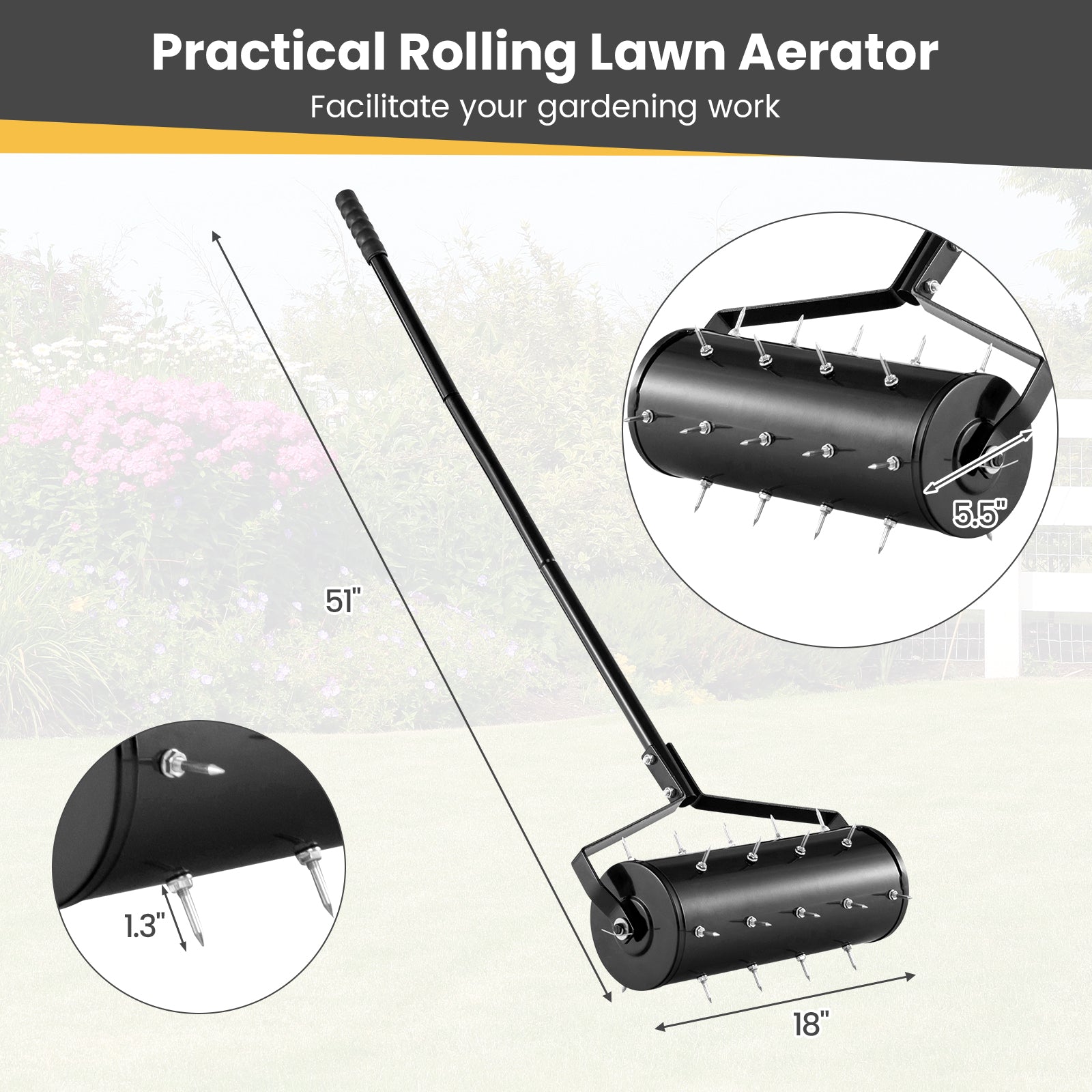 '-There is no more back pain with 51"/130 cm reasonable height-Non-slip and comfortable handle will reduce pain in hands-27/33 galvanized steel spikes are rustproof and not easy to deform-1.3"/3.4 cm spikes can effectively loosen soil and promote the plant grow-With 5.5/6.8L capacity to fill sand or stone, the spikes can penetrate into soil easily-Solid metal construction with painted surface ensures the resistance to rust-Suitable for different types of soil, such as sand, dirt and clay-Detachable handle features spring button for quick connection