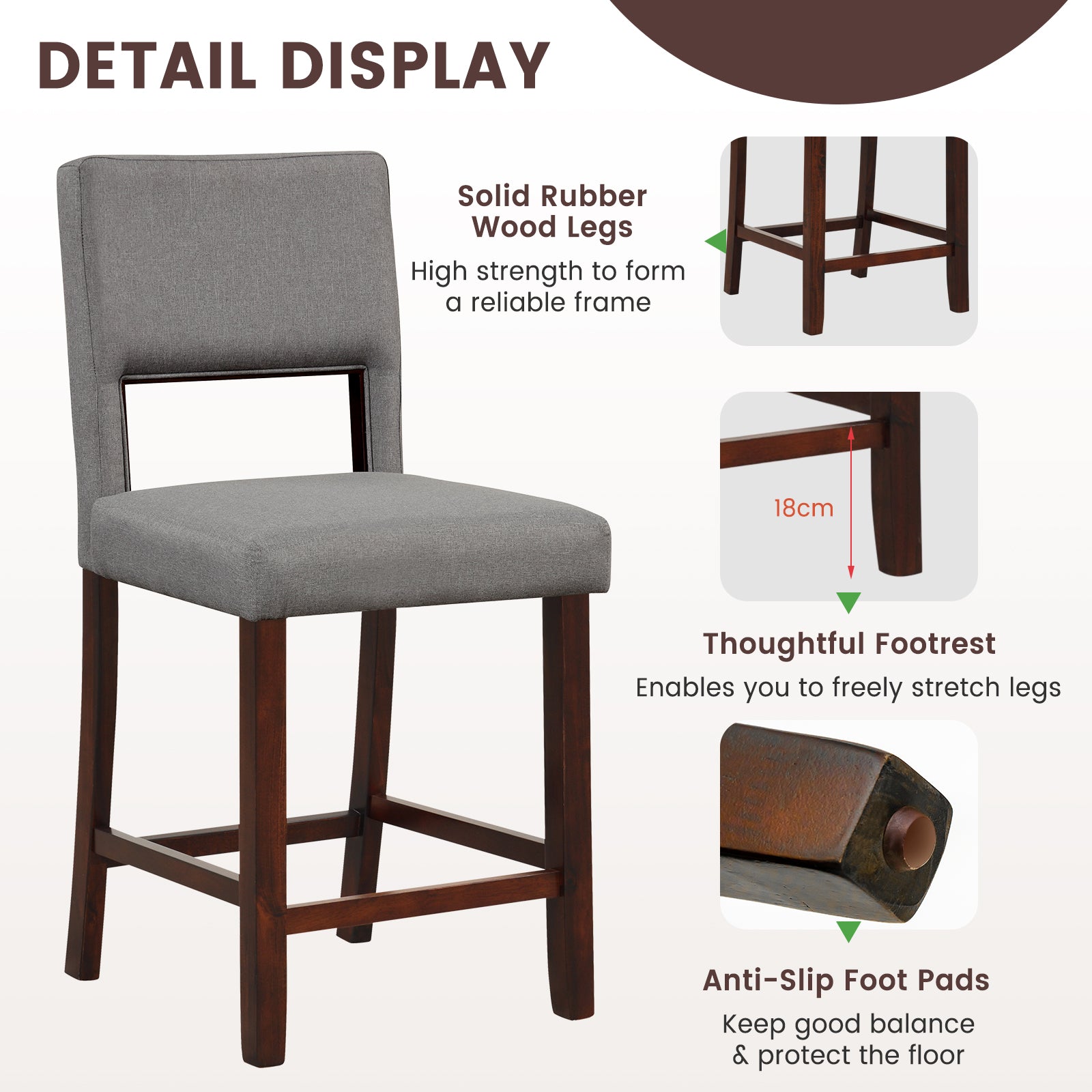 The bar chair set of 2 could better cater to your family and guests! Each bar stool features a hollowed back and a padded seat, allowing you to find the most comfortable sitting position. In particular, they are upholstered with premium linen fabric and sponge for a super cozy touch. With solid rubber wood legs, each counter-height stool could bear up to 400 lbs. Sit on the bar chair, stretch legs on the 7" high footrest, what a pleasure it is. As for the detail display, its anti-slip foot pads will protect the floor from being scratched, ensuring safe using in the kitchen, pub or cafe. Certainly, the whole assembly is easy. If you are looking for a bar chair set like this, do not hesitate to place an order! Cozy Hollowed Back: There are 2 bar chairs in the package. Each bar stool features a 15" high back with a hollowed design. So it will bring extremely comfortable support, while reducing stuffy feelings on your back during sedentary. Comfortable Material: Both backrest and seat share the same high-quality linen fabric and sponge to create an enjoyable sitting experience. Especially the high-density sponge feels super elastic and is very durable to resist deformations. Rubber Wood Support: Each counter height chair has strong legs, made of natural rubber wood, to promote overall sturdiness and load capacity up to 400 lbs. Also, it is designed with anti-slip foot pads, which prevent slipping and protect the floor. Thoughtful Footrest: With a 7" high footrest, each counter height stool could serve a better purpose in a tasteful space, like home kitchen, pub, cafe and more. When you get tired, it would be perfect to stretch and rest your legs on the footrest. Easy Assembly and Classic Design: Included manual offers clear instructions, while the installation is fairly simple. Being exquisitely stitched, each bar chair presents a full & low-pitched look, which could be a stylish visual center.