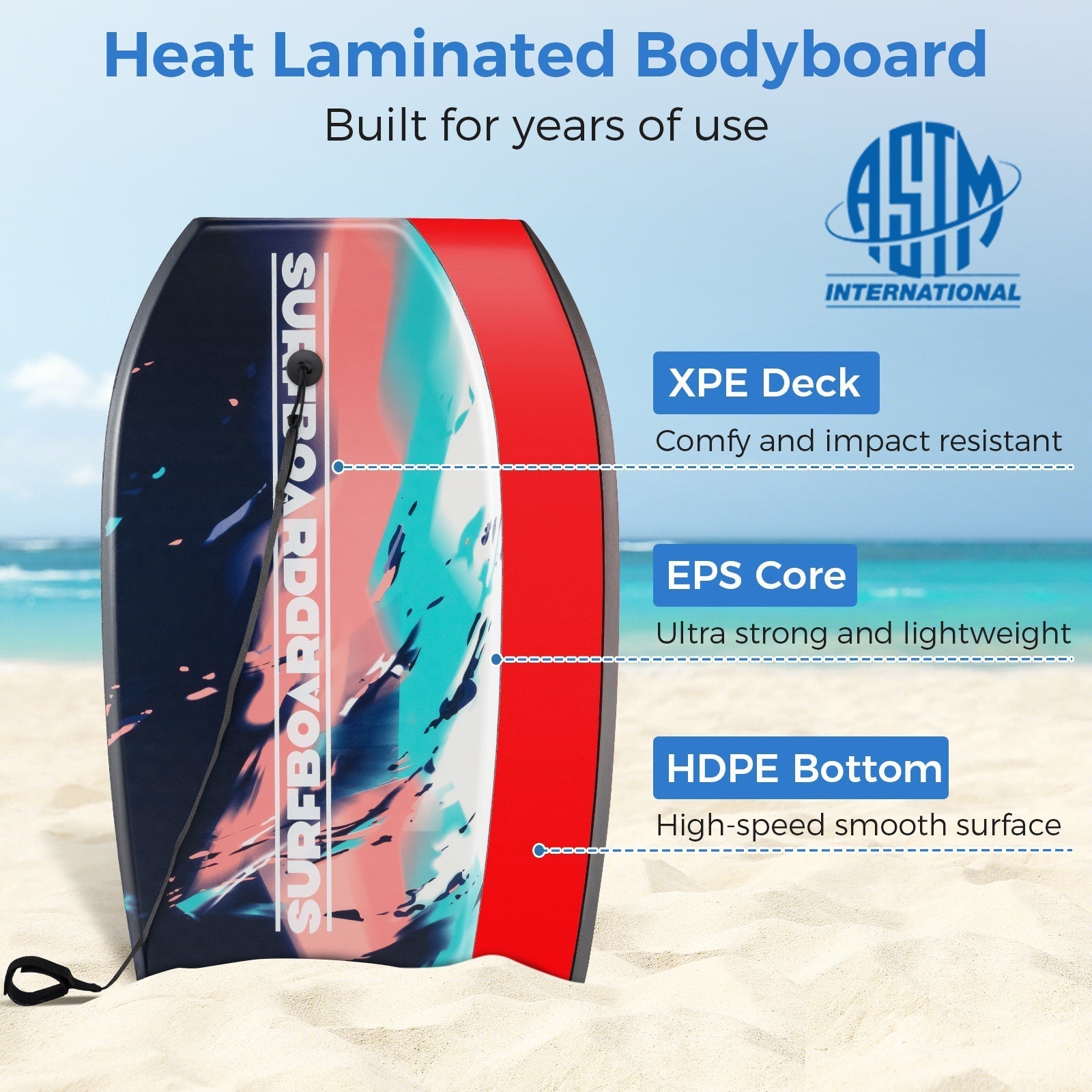 -Designed with 60/40 rail and crescent tail to boost speed and control -Constructed with a HDPE bottom and dual bottom channels -Equipped with a comfy and impact-resistant XPE deck -Ensures long-lasting service with an EPS core -Package includes a detachable and adjustable wrist leash -Easy carrying to the beach, pool, or any outdoor activities -Suitable for kids, teens and adults to ride