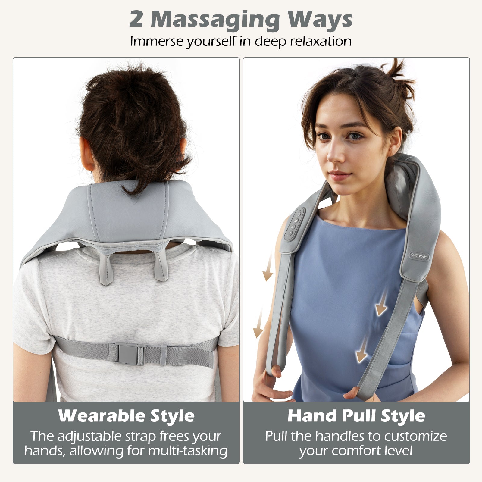 This portable and lightweight cordless massager is your go-to solution for soothing muscle tension and promoting overall well-being, targeting various areas of your body, including shoulders, neck, lower back, and legs. It comes with 4 massage heads, including 6 massage points, mimicking the touch of human hands, ensuring deep tissue massage for maximum relief from muscle soreness. There are 2 modes and 2 levels of intensity for you to choose from. With 2 heating levels ranging from 40-45 °C, it could effectively promote circulation and improve sleep quality. Furthermore, this innovative massager offers a truly hands-free experience, allowing you to choose between two massaging ways: hand pull style with pulling handles and wearable style with adjustable straps. Thanks to its cordless design powered by a 2500mAh battery and featuring a convenient Type-C charging port, you can relax anytime, anywhere. Treat yourself or someone special to the gift of relaxation and let the stresses of the day melt away. 2 Massaging Ways and Hands-Free Massage: This neck shoulder massager features pulling handles that allow you to easily adjust comfort levels, while the adjustable straps free your hands, allowing for multi-tasking - catch up on watching TV, cooking, cleaning, working, while enjoying a relaxing massage. Cordless Design: Equipped with a built-in 2500 mAh battery and a convenient Type-C charging port, this electric massage machine lets you enjoy soothing massages anytime and anywhere without the hassle of wires. Enjoy approximately 2 hours of massage time on a full charge of about 3.5 hours, running 12 times on a single charge. 4D Deep Tissue Kneading Massage: The back massager features 4 massage heads with 6 massage points that offer human-like massage performance from the neck to the trapezius and shoulders, ensuring comfortable and effective relief every time. Choose between 2 modes and levels of intensity to customize your massage experience. Soothing Heat Function: This shiatsu massager comes with a 2-level adjustable temperature ranging from 40-45 °C, which could effectively promote blood circulation, so as to soothe muscle stiffness and pain. In addition, it features a 10-min auto shut-off for safety, complemented by a clear control panel for easy operation. Multi-Body Massage and Portable Design: The cordless massager offers tailored relaxation across multiple body areas including neck, shoulders, waists, and legs. Also, it is compact and lightweight, perfect for home, office, car, or travel use. Ideal Gift Choice: The neck shoulder massager is the perfect gift for parents, friends, family, or partners for any occasion - be it holidays, birthdays, Christmas, Valentine’s Day, Father’s Day, or Mother’s Day. Show your care and appreciation with the gift of relaxation and wellness.