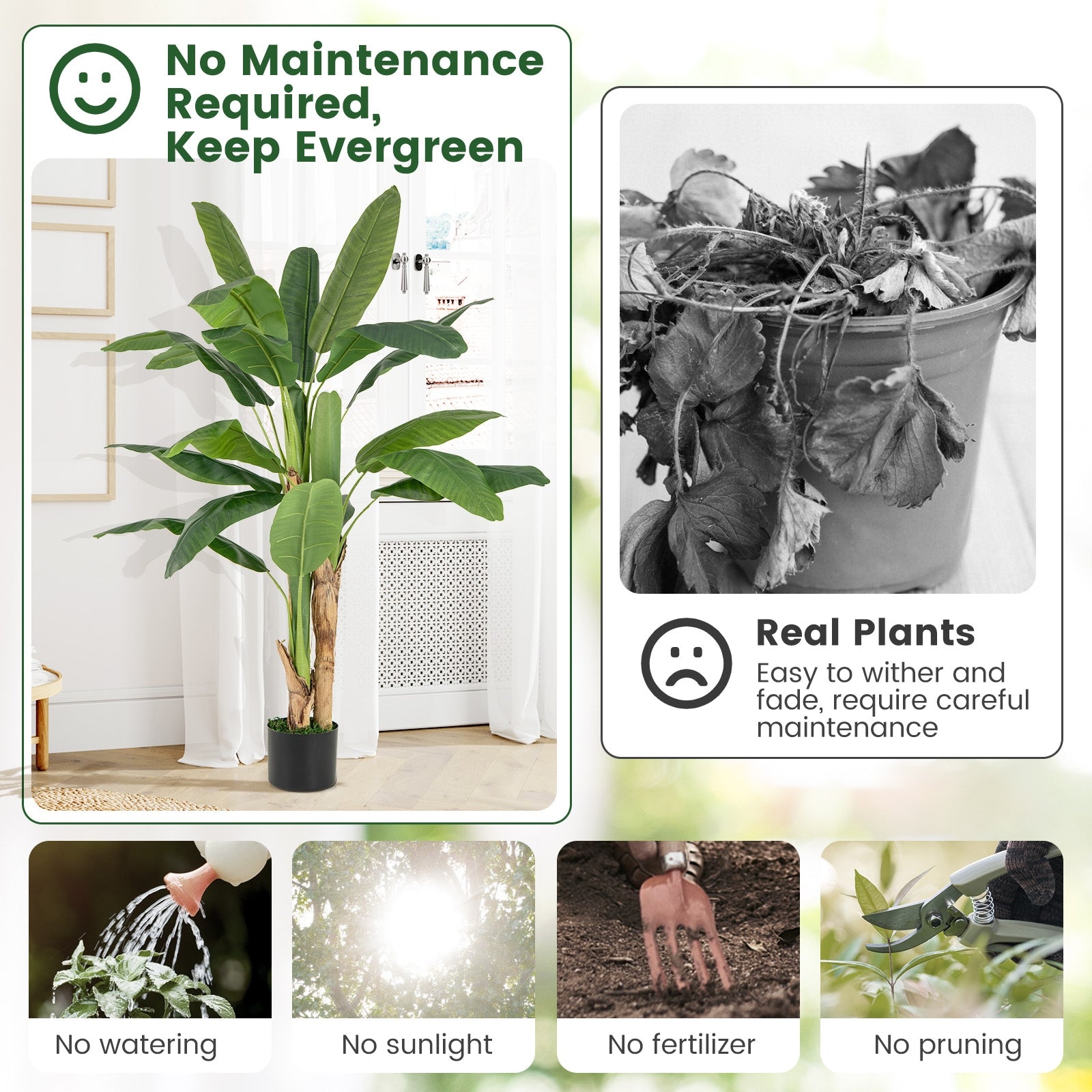 ● Vivid and Natural Appearance:This 63" tall artificial plant boasts 18 large lifelike leaves with vibrant hues and realistic textures, which are designed to replicate the beauty of banana leaves. Additionally, it features simulated trunks and realistic moss, making the tree more natural.● High-Quality and Maintenance-Free Material:The faux leaves are crafted of premium polyester fabric, which is not only non-odor and non-allergic for safety but also crack-resistant and built to last. Moreover, it requires no watering, sunlight, fertilizer, or pruning, keeping evergreen.● Stable and Reliable Structure:The fake tropical palm tree is supported by a stable flowerpot filled with cement, preventing children or pets from knocking it down easily. Alternatively, you can place it in a larger decorative pot for an even more aesthetically pleasing look.● Versatile Decoration:Whether adorning a cozy living room, a welcoming front door porch, a professional office space, or a trendy cafe shop, this versatile artificial banana leaf tree effortlessly elevates any indoor environment with its lifelike charm.● Require No Assembly:The tree may slightly deform during transportation, please arrange the branches to restore its original shape after unpacking, and then adjust the leaves for a fuller shape. Additionally, the moss comes separately packaged for even placement on pot top.