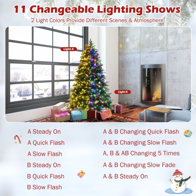 581/899 PVC and PE branch tips create a lush and leafy appearance. The real pine cones and polished red berries are hidden among the verdant leaves. The snowy design on the tips enhance home a touch of winter scene. Besides, 250/350 bright LED lights with 2 changeable colours are evenly distributed on the dense tree, making the home full of a charming vibe. Thanks to the 11 dynamic effects of the lights, you can enjoy the beautiful lighting show at night. And all these ornaments are pre-strung, and you don't need to spend more time. Besides, the branches with hinged design facilitate fluffing and assembly, which can save your energy. All in all, the life-like hinged Christmas tree is an eye-catching holiday decoration to spread luck on all occasions. Pre-Decorated Lush Christmas Tree: Comes with 581/899 branch tips, 28/35 plump pine cones and 28/35 clusters of red berries, this artificial Christmas tree creates a lush and charming appearance. Besides, the snowy design on the tips enhances the wintry vibe and natural vividness. Provide Charming Lighting Shows: Equipped with 250/350 bright LED lights, this 2-color changeable Christmas tree brings home romantic vibe and beautiful lighting show. There are 11 dynamic effects for you to choose from, such as steady on, quick flash, slow flash, changing flash and changing fade. Durable PE and PVC Material: Made of premium PE and PVC material, this realistic Xmas tree is safe and inodorous for family long-term use. 2 different leaf shapes and materials show natural shades of gradation, providing a real and dense look. Hinged Design for Quick Set-Up: Thanks to the hinged structure, the life-like pine tree is easy to fluff and assemble. All branches will automatically drop to the designed place, which can save you time and energy. Besides, the tree is supported by folding metal stand, ensuring high stability. Eye-Catching Festival Decoration: Uprightly standing Christmas tree with full-bodied shape makes it attractive and elegant. The shiny tree at night offers beautiful scenes and strong festival vibe. You can add extra ornaments for better spreading endless happiness and sincere wishes.