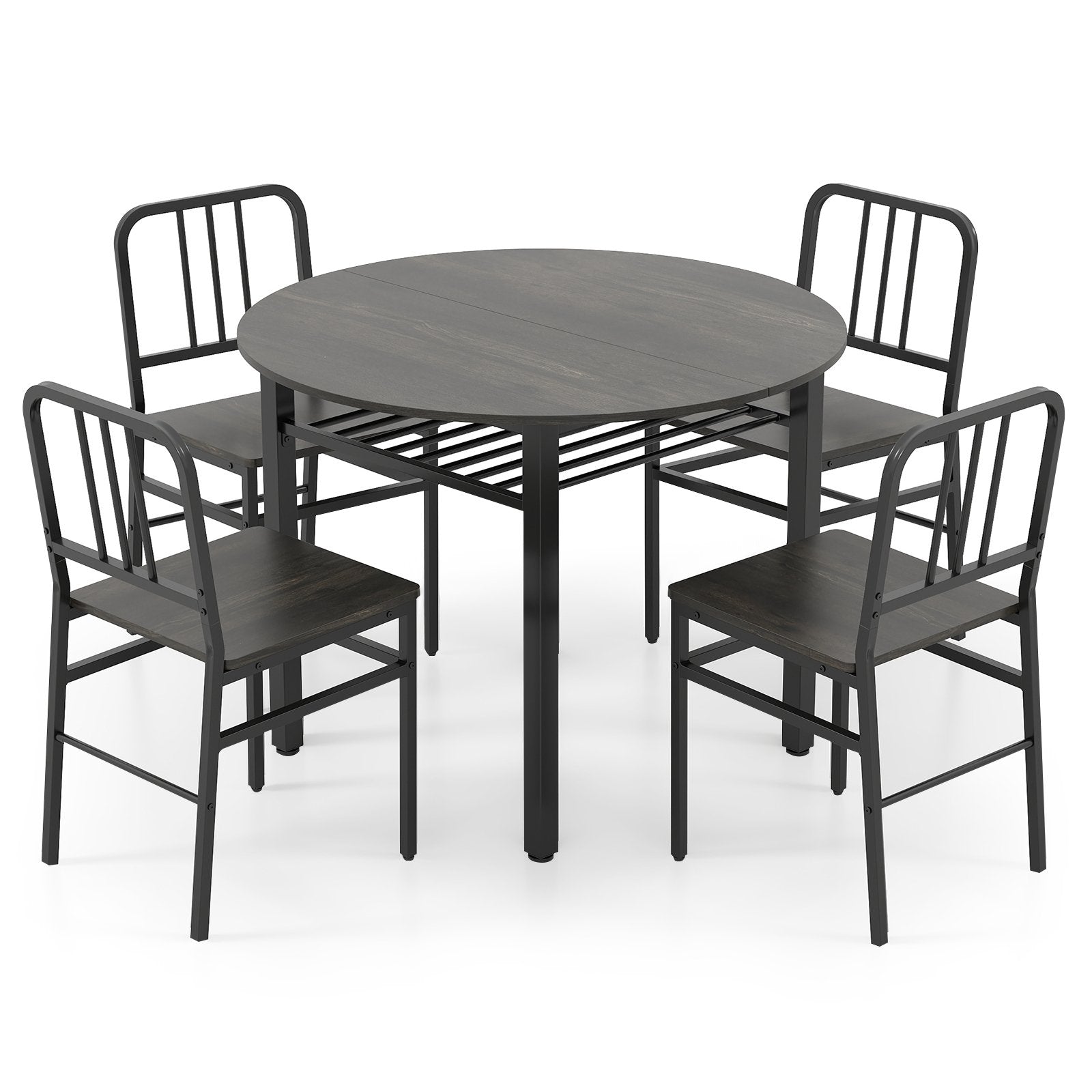 The kitchen chairs in the compact 5-piece dining set are ergonomically designed for an enjoyable dining experience. Moreover, the chairs can be conveniently tucked away underneath the table post-meal, making it perfect for smaller dining areas or intimate spaces. Additionally, the dining table set comes with a cleverly integrated storage rack beneath it, allowing you to efficiently arrange your dining necessities for easy access. Constructed with a robust metal frame, both the table and chairs offer exceptional durability and steadiness. Furthermore, the table is topped with a veneer finish, simplifying the cleaning process. The dinette set's faux wood finish, combined with metallic accents, brings a hint of classic charm to your living area. Versatile 5 Piece Dining Set: The versatile 5-piece dining ensemble encompasses a kitchen table measuring 100 x 76 cm (Dia. x H) paired with 4 armless chairs sized at 45 x 40 x 80 cm (L x W x H). Perfect for enjoying intimate meals or hosting cozy gatherings, this dining set is an ideal choice. Space-saving Design: Boasting a space-saving design, the armless chairs can be neatly tucked under the table post-meal, catering well to those with limited space like apartment residents or individuals with compact rooms. Open Storage Shelf: The round table features a storage rack, ideal for organizing wines, snacks, tableware, tissues, or books within easy reach during dining occasions. With a ground clearance of 45cm, the storage shelf ensures ample legroom for comfortable seating. Sturdy and Stable Construction: The dinette table and chairs boast legs made from a powder-coated metal frame, ensuring a long-lasting and sturdy construction. Furthermore, adjustable foot pads on both the table and chairs provide stability on uneven surfaces. Modern and Rustic Style Twist: The 4 pieces dining set showcases a rustic wood grain that adds a timeless appeal. Plus, the sleek line backrests infuse a modern touch, making it suitable for a variety of settings like kitchens, dining rooms, breakfast nooks, or restaurants.