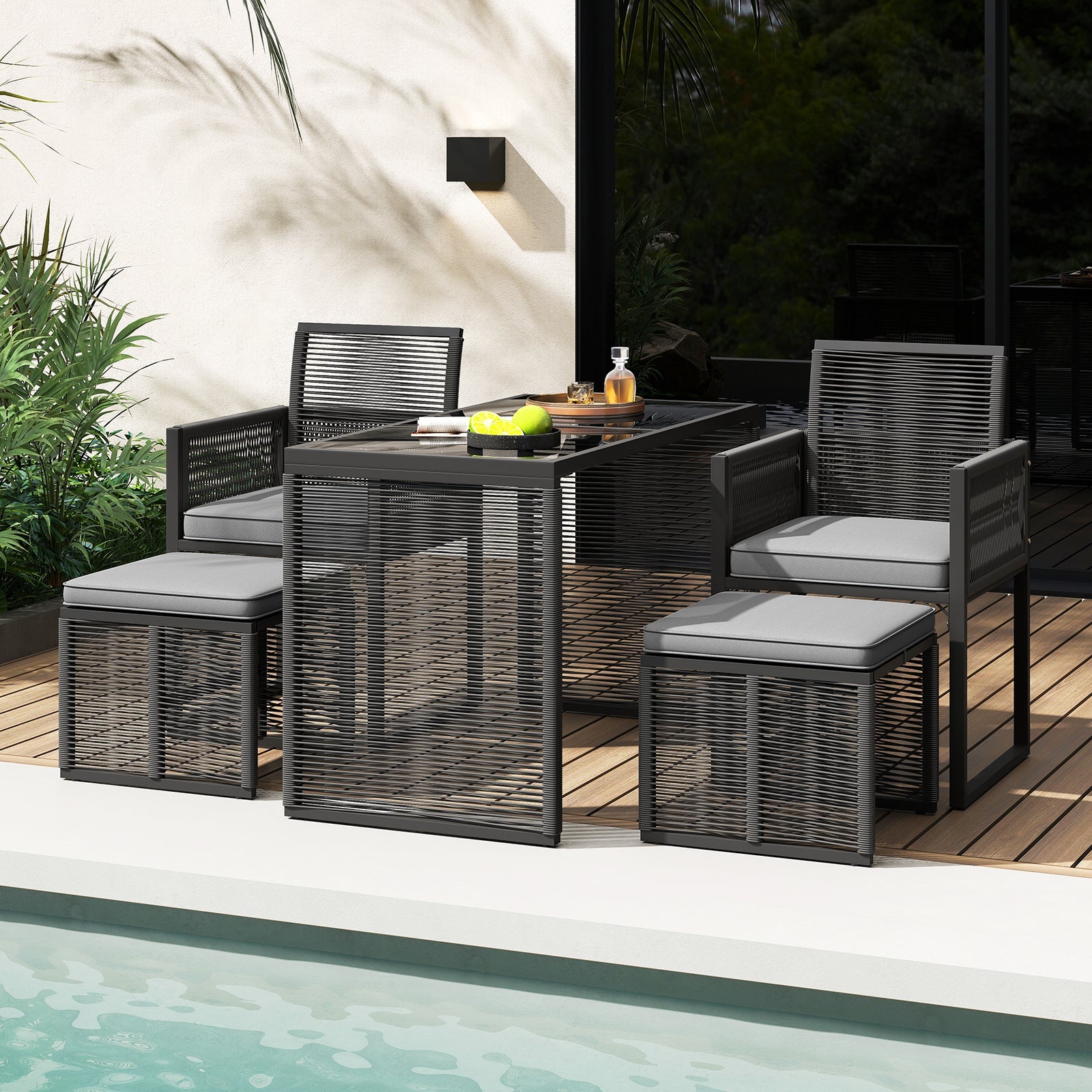 The reliable construction ensures great sturdiness. The sturdy metal frames offer optimal stability for each chair and ottoman supporting up to 180 kg. The tempered glass tabletop is enduring, sturdy, and easy to maintain. This space-saving set features foldable backrests and the ottomans can be stored under the chairs. The elegant hand-woven PE rattan material is anti-fading and sun-protective, enhancing any outdoor space. Perfect for gardens, decks, and more, this outdoor dining set provides a luxurious and cozy outdoor experience. If you are looking for such a product, do not hesitate to buy it! Experience Great Comfort: The patio conversation set features removable cushions that are filled with elastic sponge for a plush feel, while the contoured backrests and ergonomic armrests provide optimal support. Plus, the zippered cushion covers make maintenance a breeze. Built for Lasting Longevity: The robust metal frame, equipped with adjustable foot pads, ensures exceptional sturdiness and stability, with each chair and ottoman supporting up to 180 kg. The table boasts a tempered glass top that is enduring, sturdy, and stable, complete with suction cups for secure placement. Save Space with Ease: Maximize your outdoor space with the space-saving outdoor bistro set. The backrests fold down effortlessly, and ottomans can be neatly stored under the chairs, making it perfect for compact living and easy storage. Elegant Aesthetics with PE Rattan: Admire the exquisite craftsmanship of the patio furniture, featuring hand-woven PE rattan. This material is anti-fading, sun-protective, and ensures an elegant appearance that enhances any outdoor setting. Versatile for Every Outdoor Space: From gardens and backyards to decks and poolside areas, the patio conversation set is designed to enhance your outdoor living experience in any setting. Size of Table: 114 x 56 x 71 cm (L x W x H). Size of Each Chair: 53 x 52 x 85 cm (L x W x H). Size of Each Ottoman: 44 x 44 x 35 cm (L x W x H).